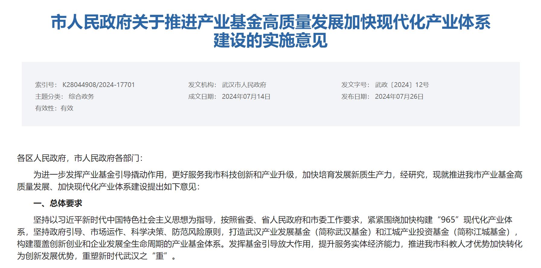 长江日报大武汉客户端7月27日讯(记者陈永权)7月26日,《市人民政府关于推进产业基金高质量发展加快现代化产业体系建设的实施意见》(以下简称《实施意见》)印发,围绕“965”现代化产业体系,我市将设立武汉基金和江城基金两只政府产业基金,通过吸引社会资本打造3000亿—5000亿元母子基金集群。