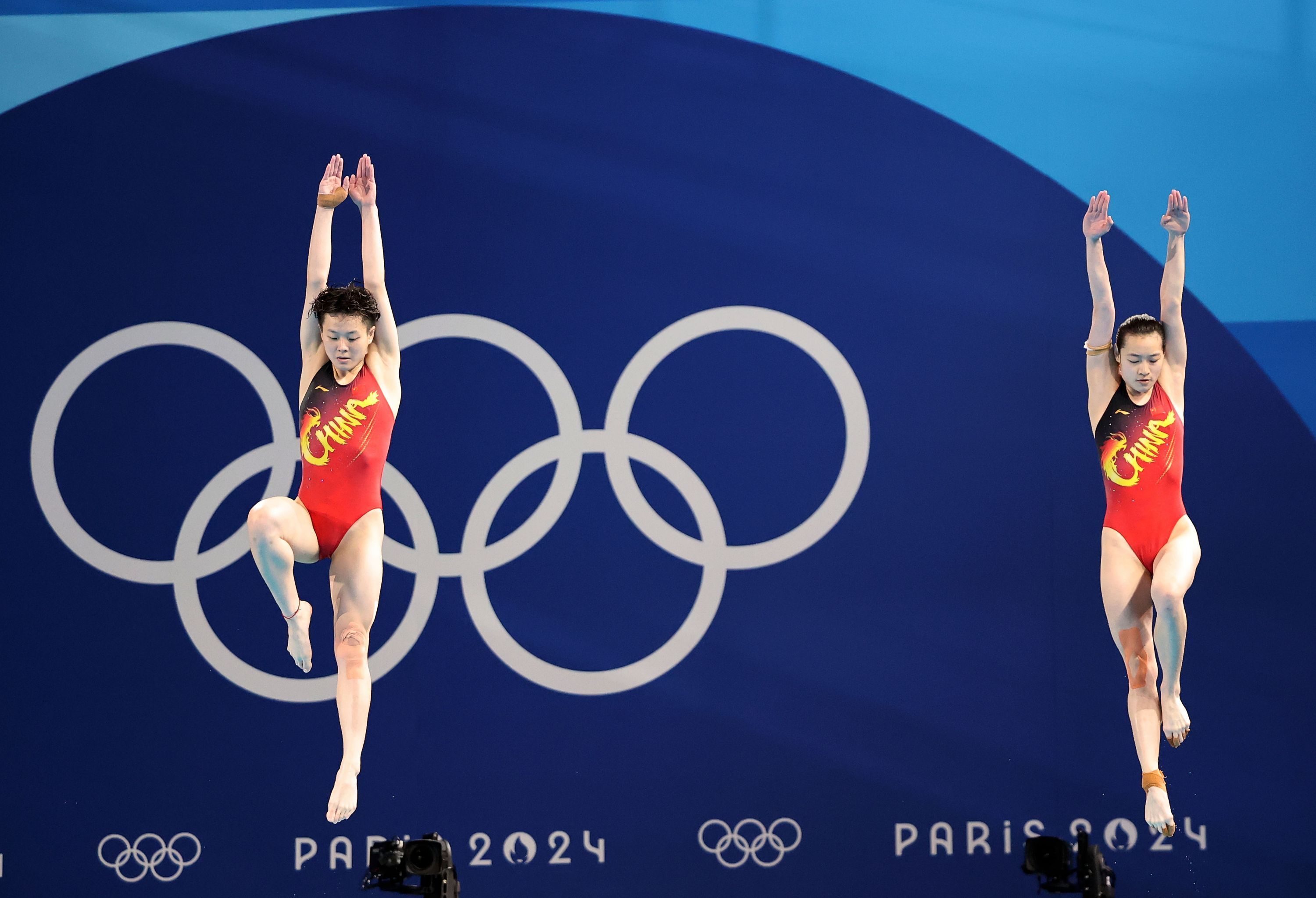 巴黎奥运会跳水女子双人三米跳板决赛,中国队组合陈艺文/昌雅妮(右)在比赛中。图:新华社