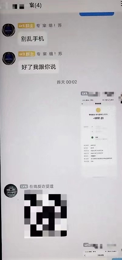 “在线反诈受理”在群里发来一张“报警回执”文件图片,文件中的字样显示强强的案件已被北京市公安局受理,图片中还有伪造的公章图片、办案民警姓名“苏XX”及警号等信息。