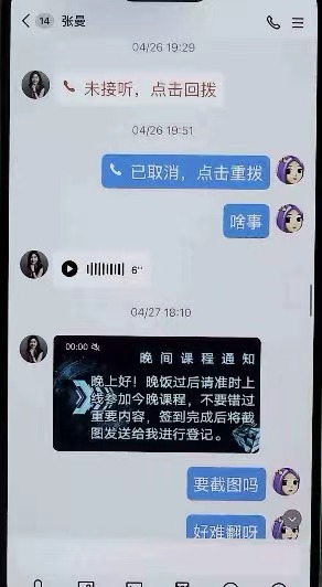受害者与诈骗分子的网上聊天记录截图。 (通讯员袁野供图)
