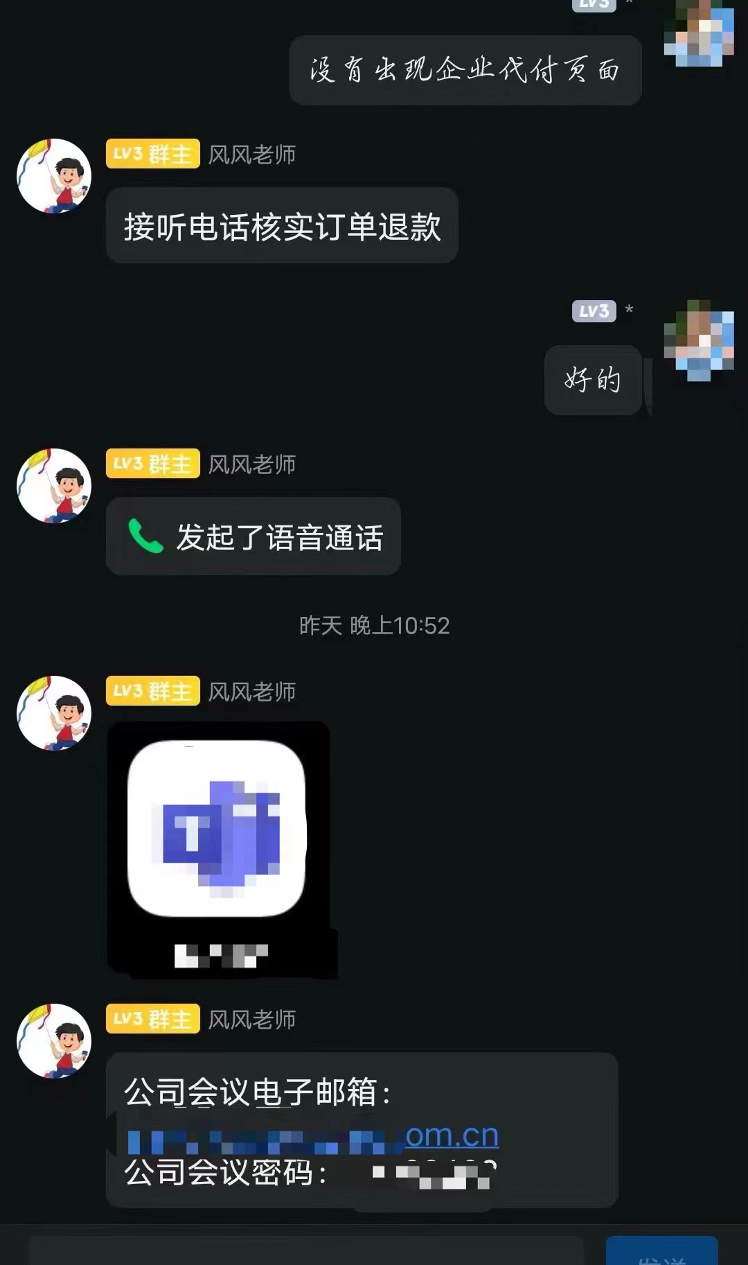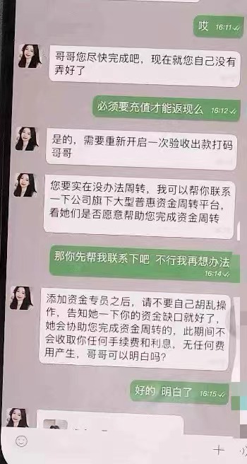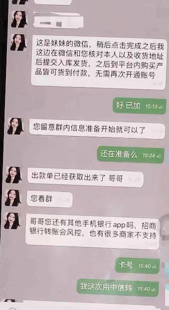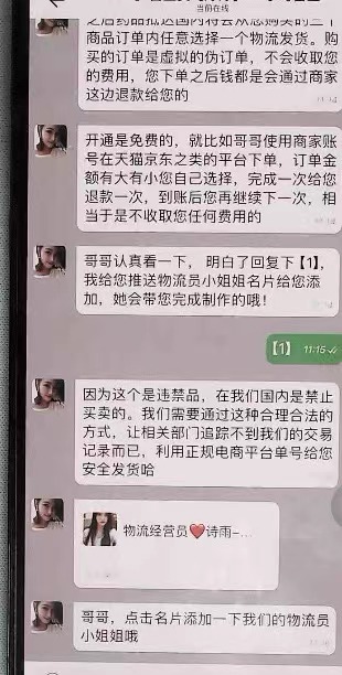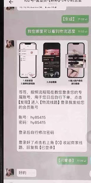“哥哥,这是您的会员专属账号。因为您买的产品受限制,所以需要您使用专属账号在我们提供的内部平台下单,生成物流单号后才能给您发货。您每次下单,我们会马上全额退款,到账后您再继续下单,保证没有费用。”
