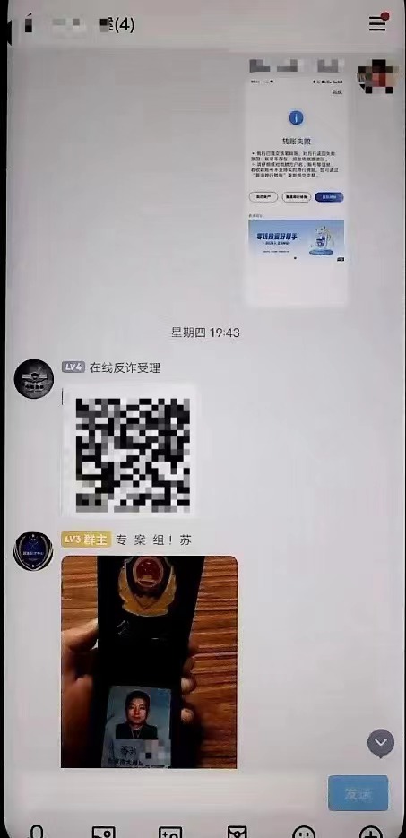接着“在线反诈受理”在QQ群里发来一张二维码图片,“苏警官”向强强解释,要强强扫码付款,是为了便于警方办案。强强此时只觉得“苏警官”在尽心尽力帮他办理诈骗案件,毫不怀疑多次扫码,还在群里反复向“苏警官”咨询,“苏警官”表示这都是“办案程序所需”。