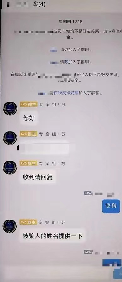“平台客服”与强强联系问明他的遭遇后,让他添加名为“专案组!苏”的QQ号,添加好友后,这位“苏警官”把强强拉进一个名为“强强专案”的QQ群,成员有“苏警官”“在线反诈受理”及强强3人。