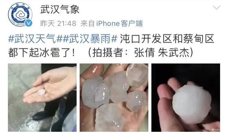 可见,冰雹的发生并不是很常见的现象,是需要非常多种的因素累积在一起才会发生,特别是昨天这种鸡蛋大小的冰雹,在武汉就更加不多见了。