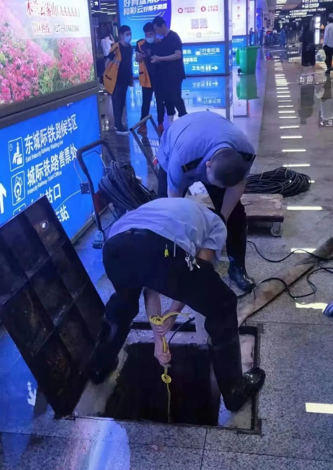 武昌站工作人员迅速出动,现场值守的设备和保洁人员准备了水泵抽排积水,并用沙袋铺地,保障旅客出行。约半个多小时后,出站口的渍水逐步消除,未对旅客出行造成较大影响。