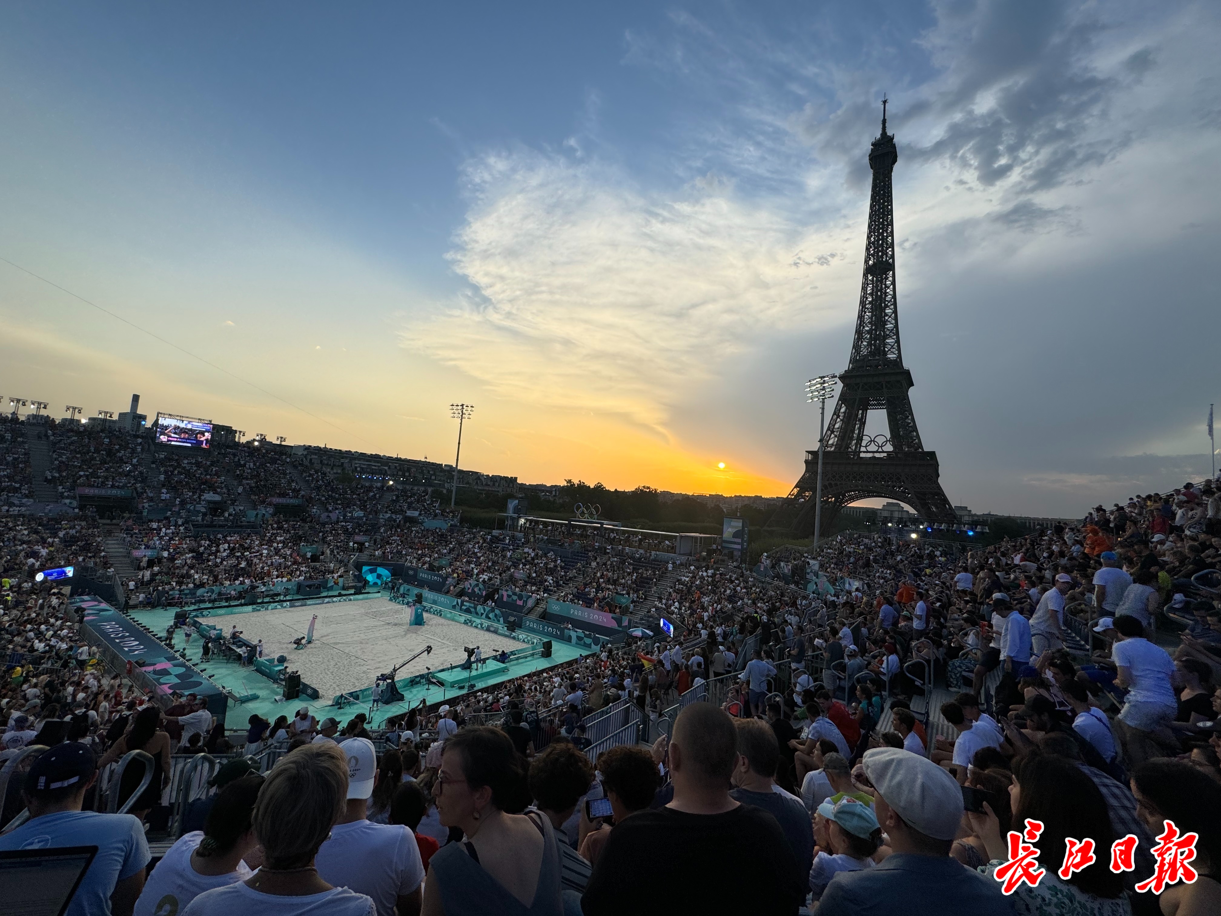 埃菲尔铁塔体育场,作为巴黎奥运会最美赛场之一,以其独特的地理位置和壮观的景象吸引了无数目光。当地时间7月30日晚上8点,美国对阵荷兰的沙滩排球比赛正在激烈进行。坐在露天看台上,抬头望向挂着奥运五环标志的埃菲尔铁塔,低头观看沙滩排球运动员挥洒激情,仿佛置身一幅优美的油画之中。