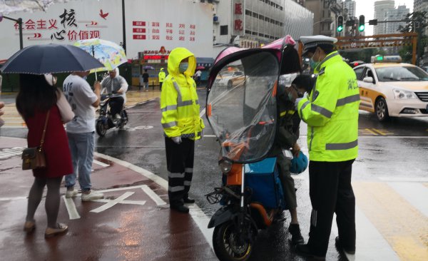交警迎着风雨走上街对各类违法行为展开专项整治,消除安全隐患,压降交通事故。通讯员杜泽文 记者杨涛 摄