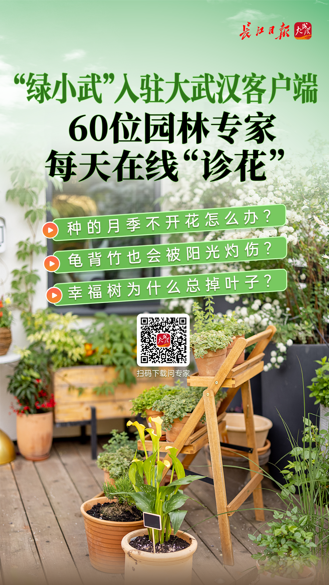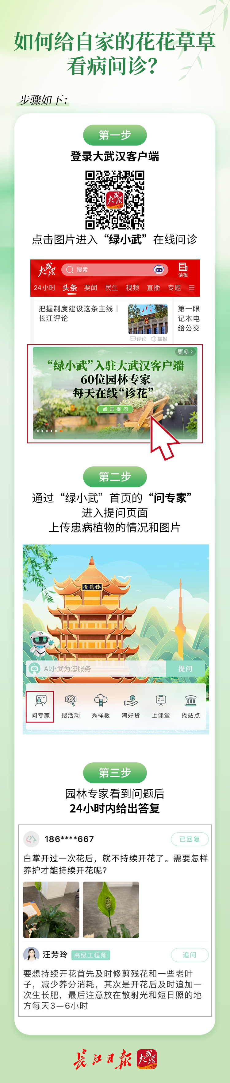 为了让市民享受更便捷及时的“问绿”服务,即日起“绿小武”正式入驻大武汉客户端,花友“植绿”“识绿”“养绿”“赏绿”“换绿”“医绿”“购绿”更方便。