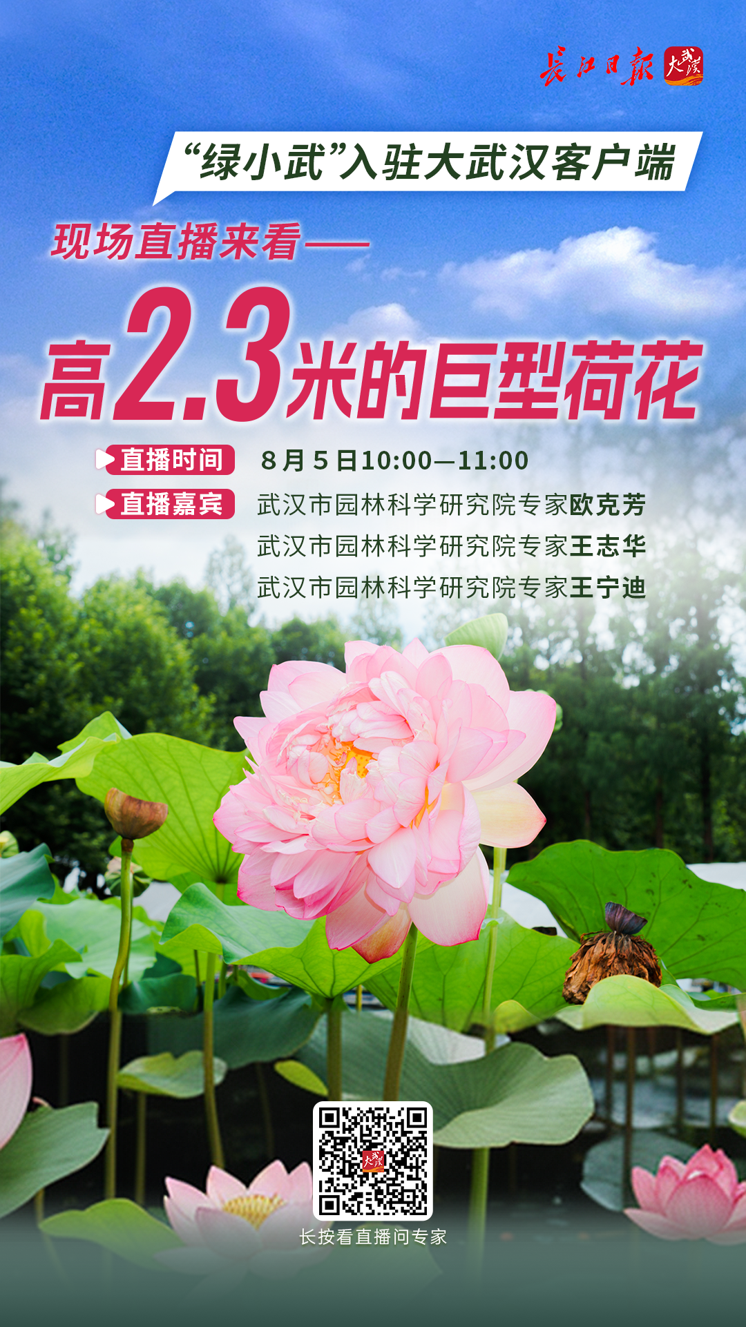 龟背竹也会被阳光灼伤?种的月季不开花怎么办?8月5日(周一)上午10:00,大武汉客户端与“绿小武”联手为市民带来福利,在武汉市园林科学研究院绿色驿站,来自“问诊天团”的3位园林专家,将做客大武汉客户端直播间,科普夏季养花种草小妙招,手把手教你给植物除病虫害。你有见过高约2.3米、花朵直径可生长至40厘米的巨型荷花吗?在直播间,可一睹“霸气十足”的荷花品种“秋三色”的芳容。大武汉客户端、长江日报微博还将开设#养花的我太难了#话题,晒出你遇到的养花问题,直播间内听专家现场为你支招。