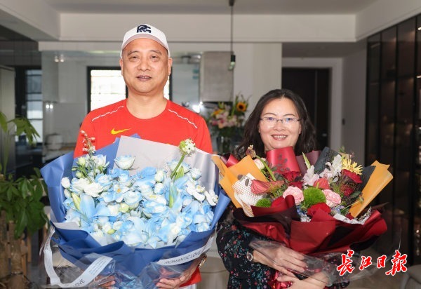 4日,郑钦文的爸爸妈妈在武汉收获鲜花。记者 胡冬冬 摄