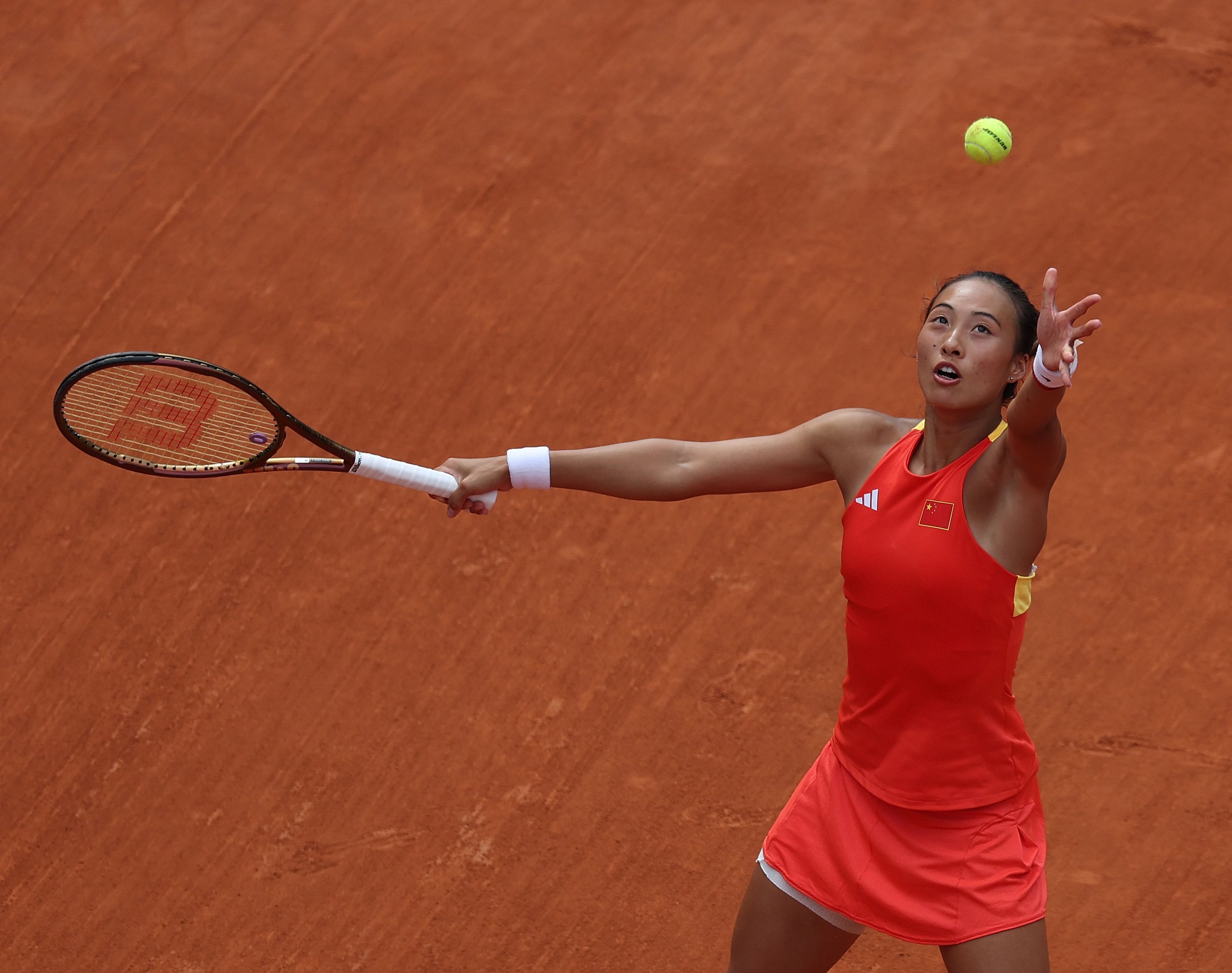 郑钦文在奥运会比赛中发球。新华社记者高静 摄