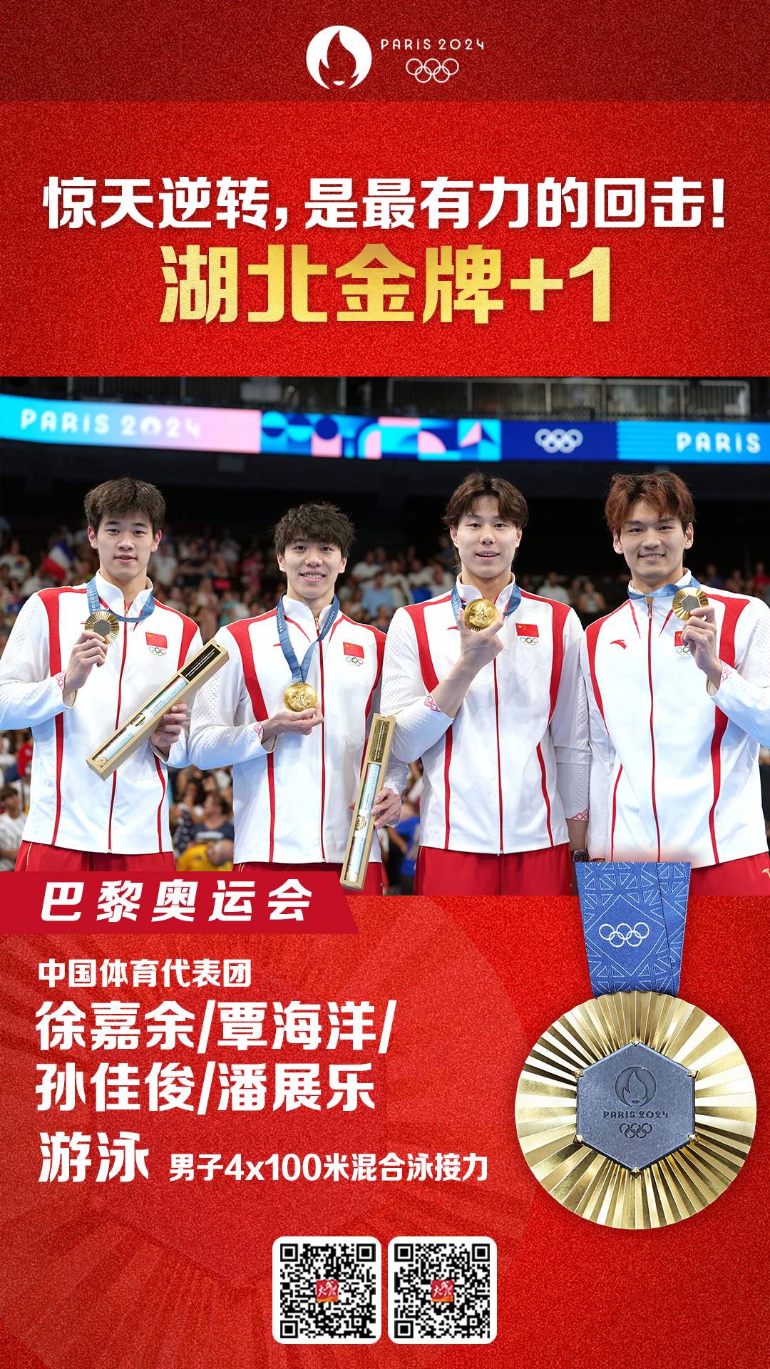 长江日报大武汉客户端8月5日讯(长江日报记者张琳)8月5日凌晨,在巴黎奥运会男子4×100米混合泳接力决赛中,湖北选手孙佳俊与国家队队友徐嘉余、覃海洋、潘展乐团结协作,奋力拼搏,以3分27秒46的出色成绩夺得金牌!这是本届奥运会上中国体育代表团的第19金,湖北选手的第4金。更重要的是,这是该项目中国奥运首金,也是湖北奥运游泳第一金!