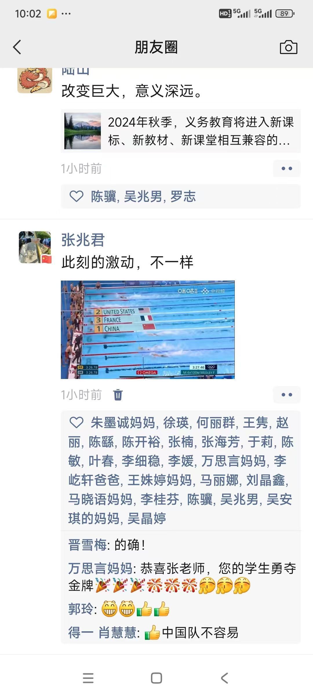 长江日报大武汉客户端8月5日讯 “此刻的激动,不一样!”北京时间8月5日凌晨,在巴黎奥运会游泳男子4x100米混合泳接力决赛中,湖北运动员孙佳俊与队友徐嘉余、覃海洋、潘展乐组成的中国队荣获金牌。孙佳俊的小学班主任张兆君发布朋友圈,表达内心的激动。