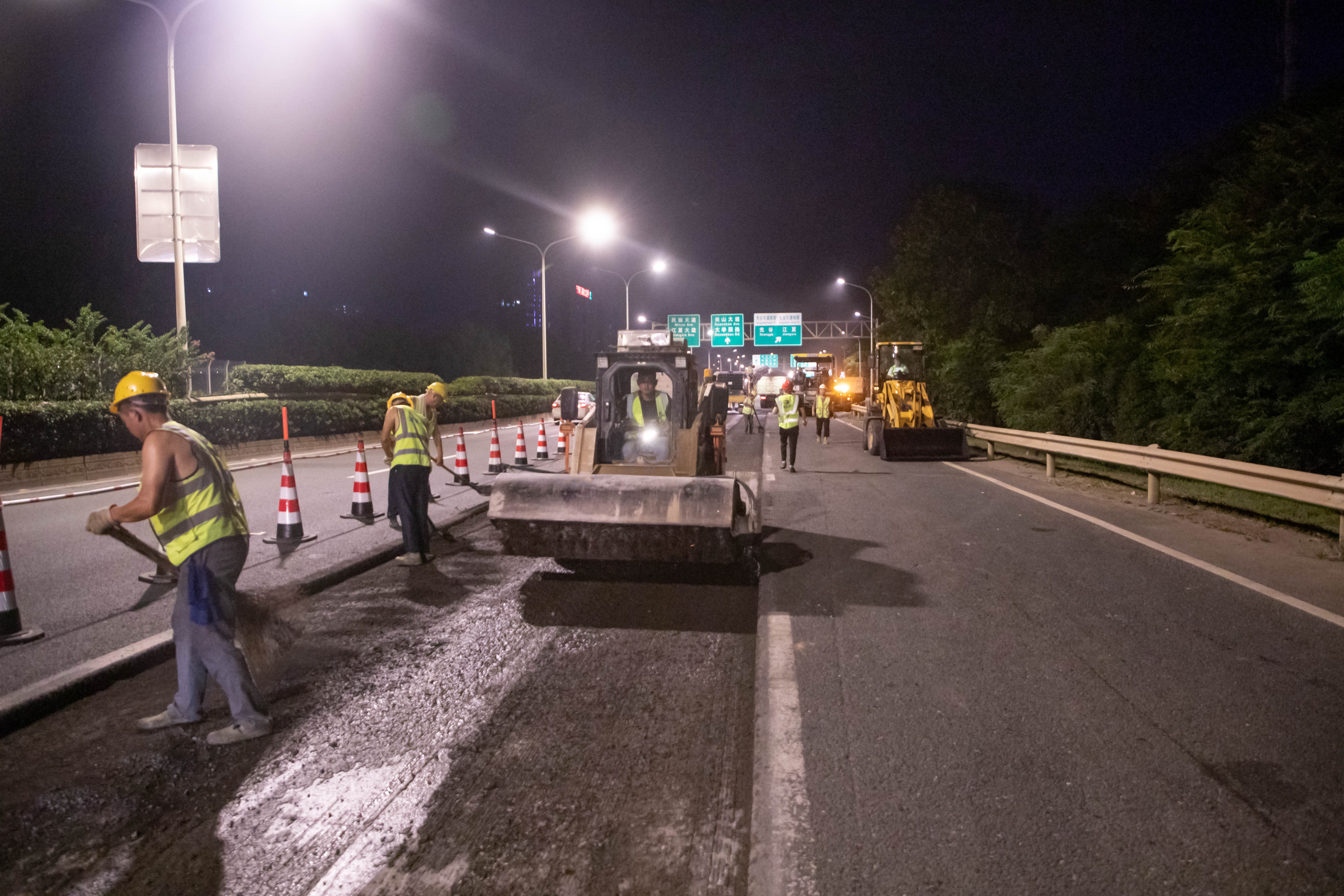 在距离本次施工现场不远处,另一处三环线路面维修现场同样热火朝天,道桥维修工人利用夜间车流量少和相对温度较低的有利条件进行路面维修作业。