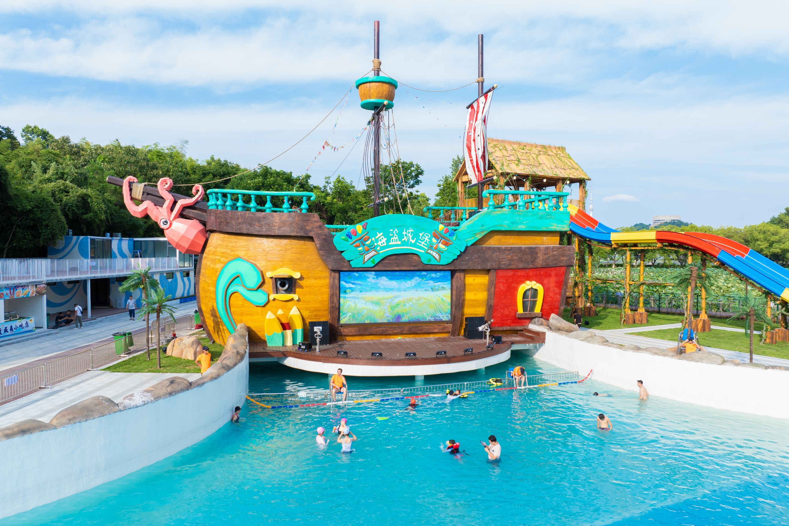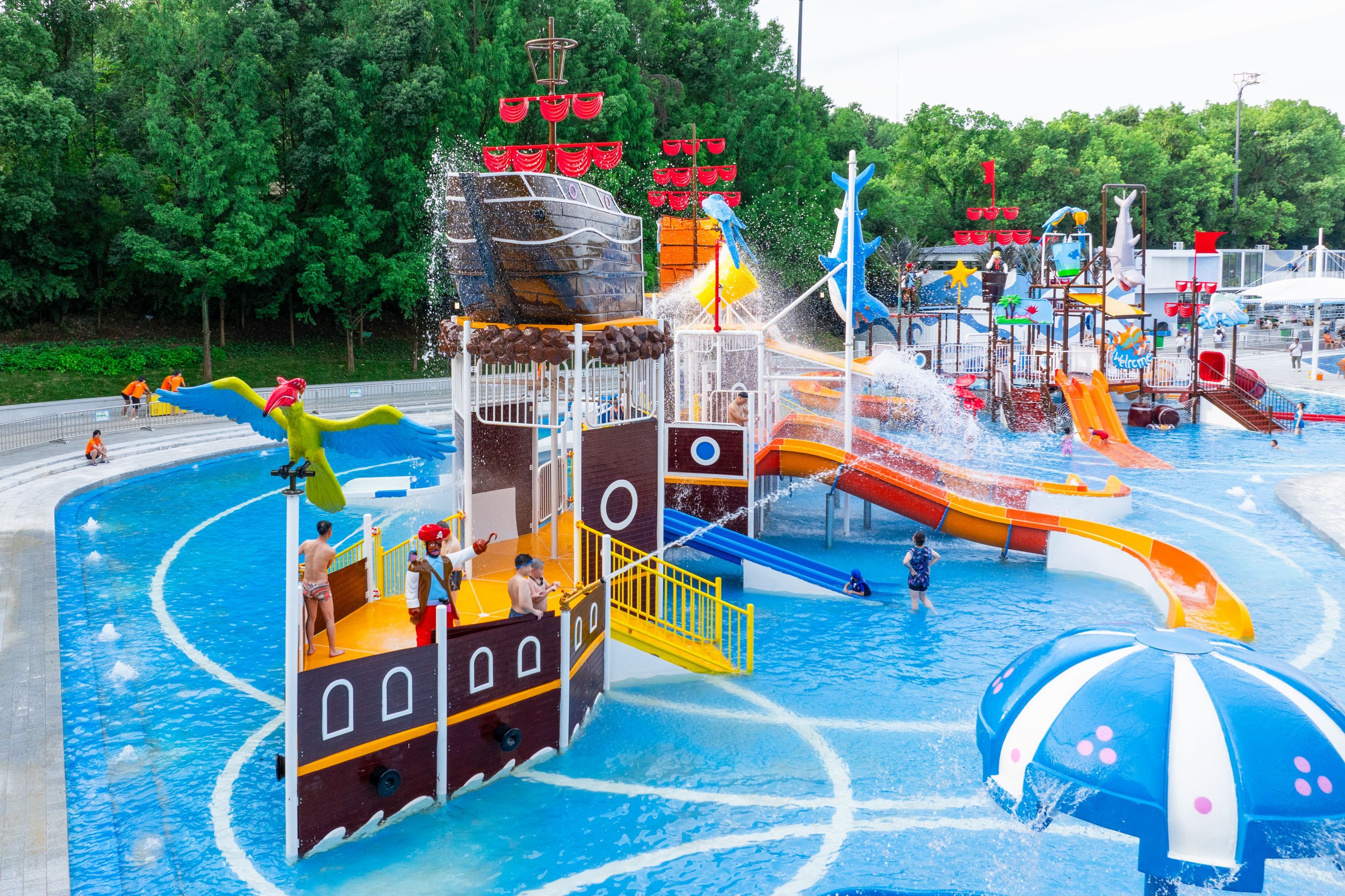 戏水区以大海船为主场景,营造出重重“水机关”。孩子们可以化身奇幻冒险电影中的主角,与海盗斗智斗勇。比如,双方可在船头用水炮对射玩耍,最高处还有大水桶泼水营造惊险气氛。