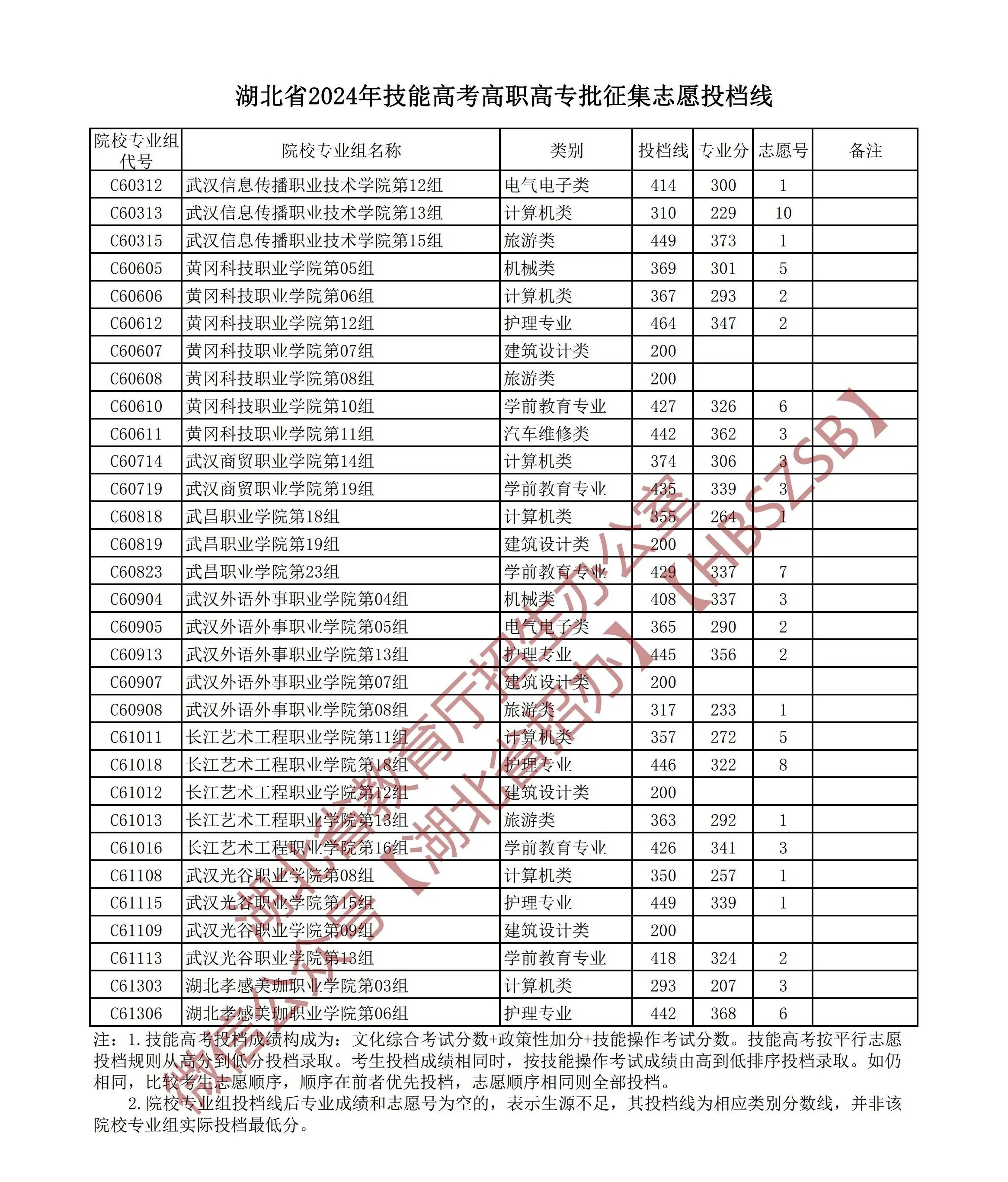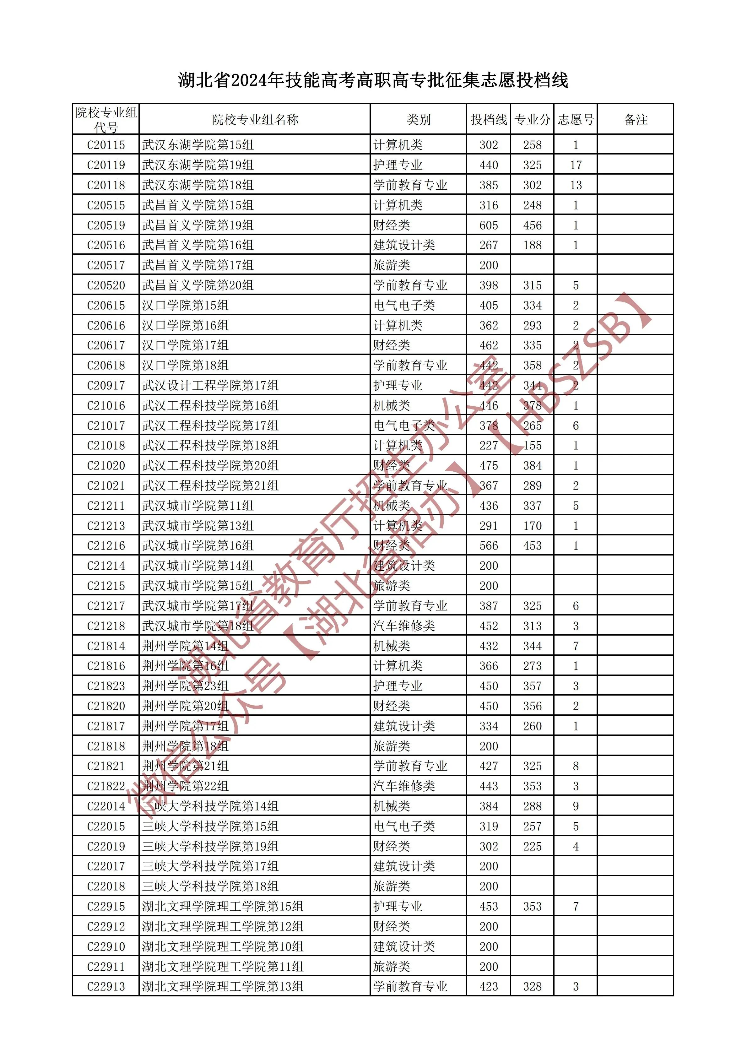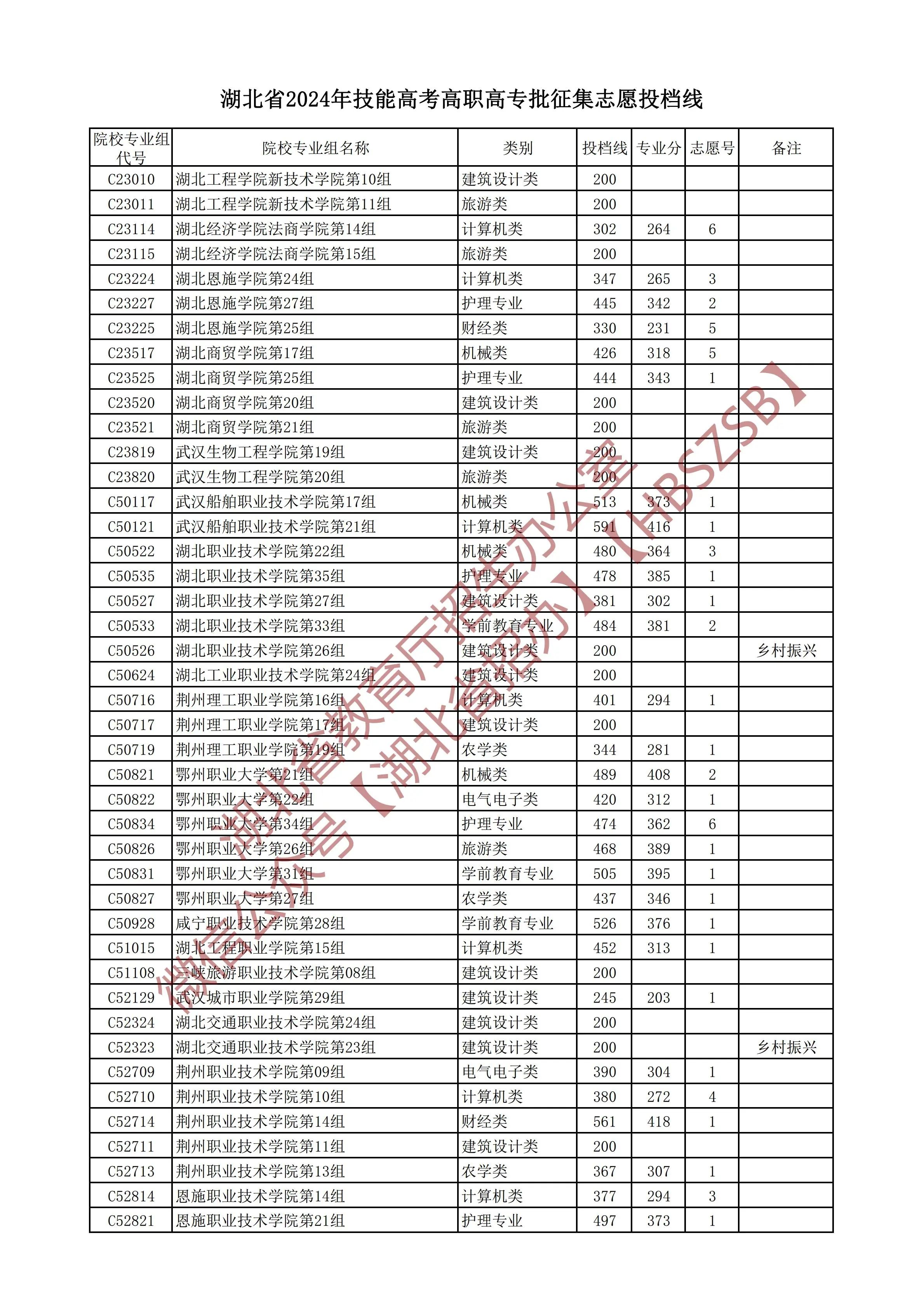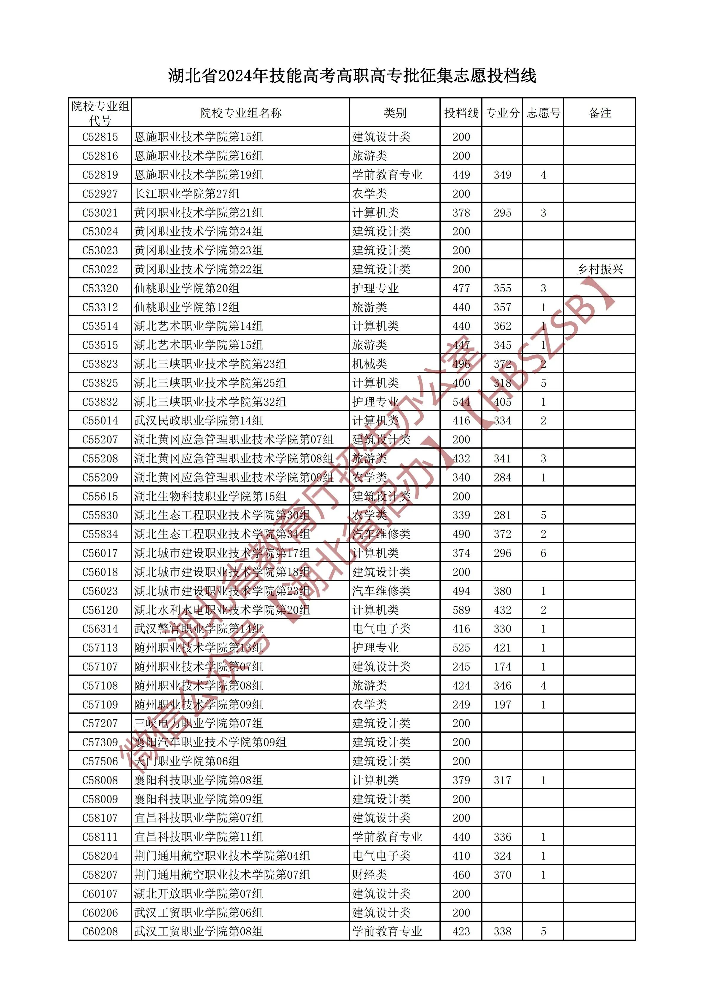 湖北省2024年技能高考高职高专批征集志愿投档线