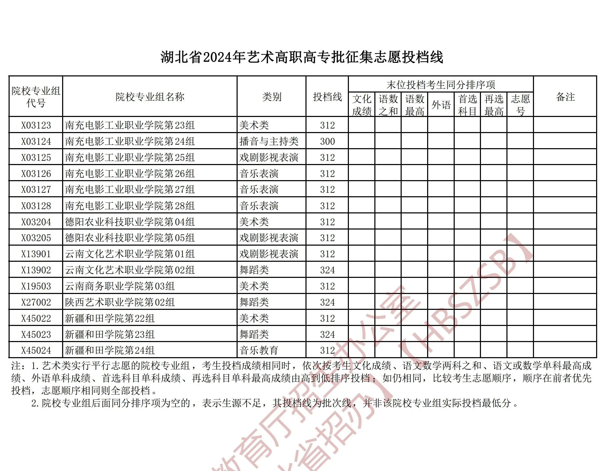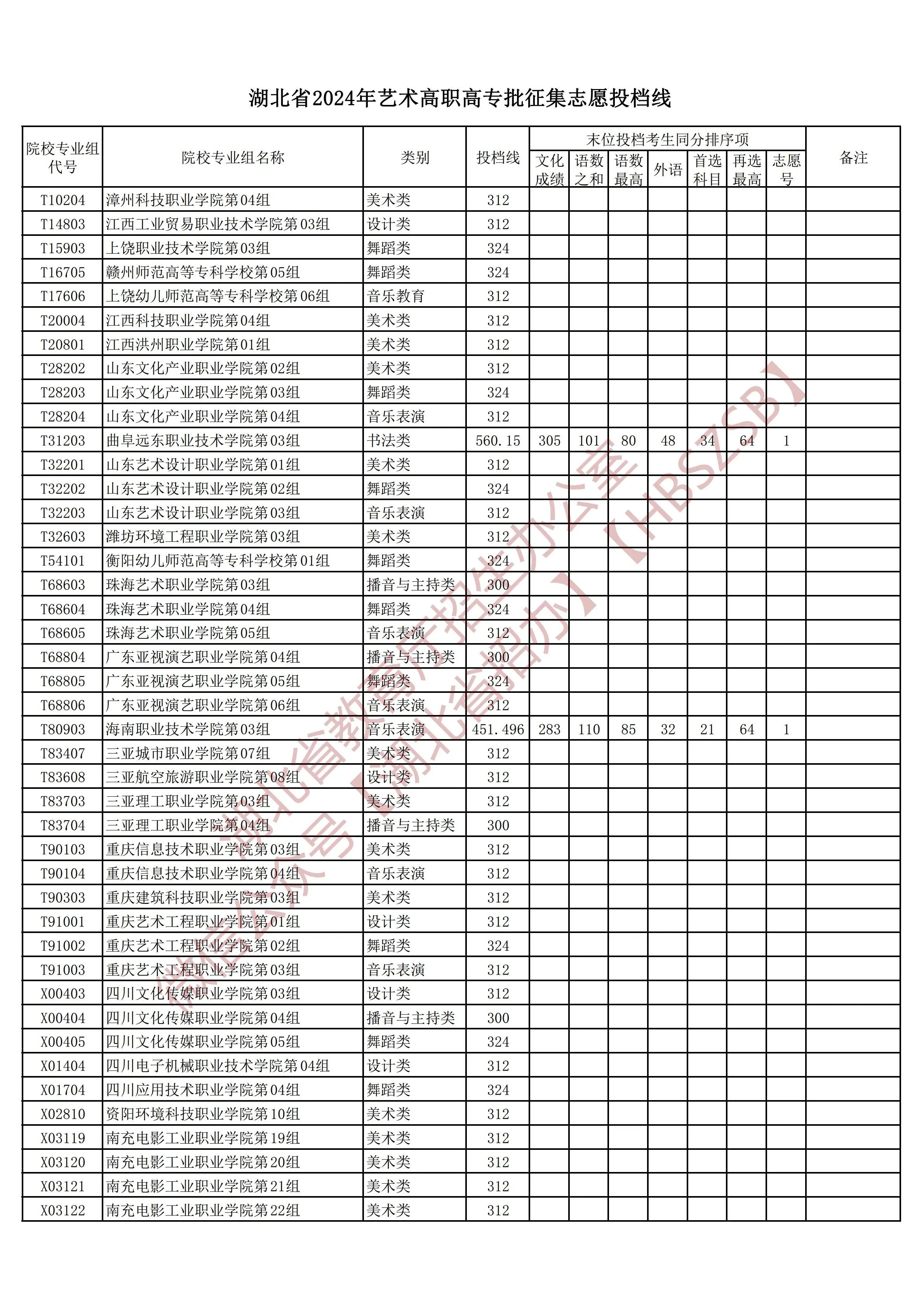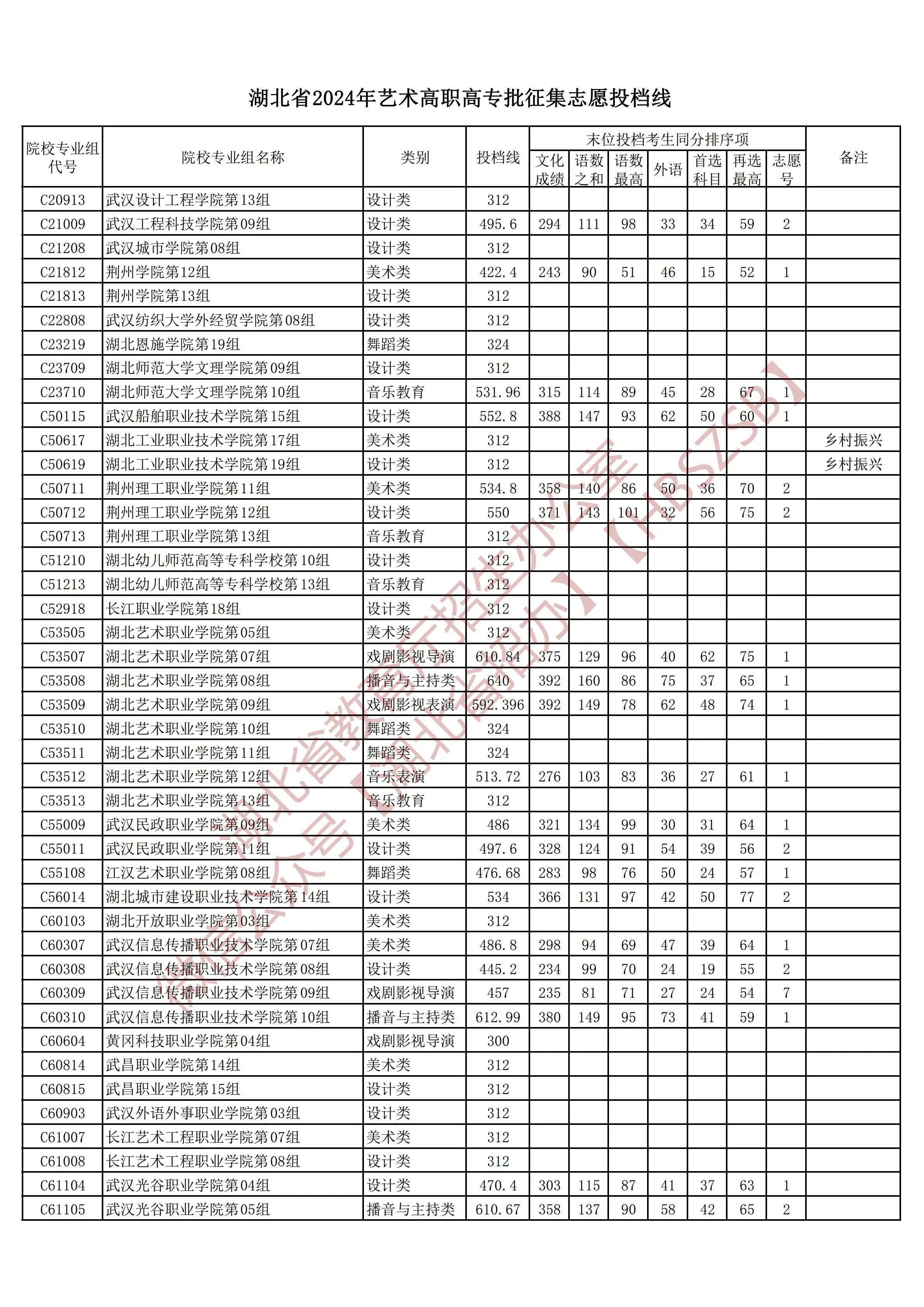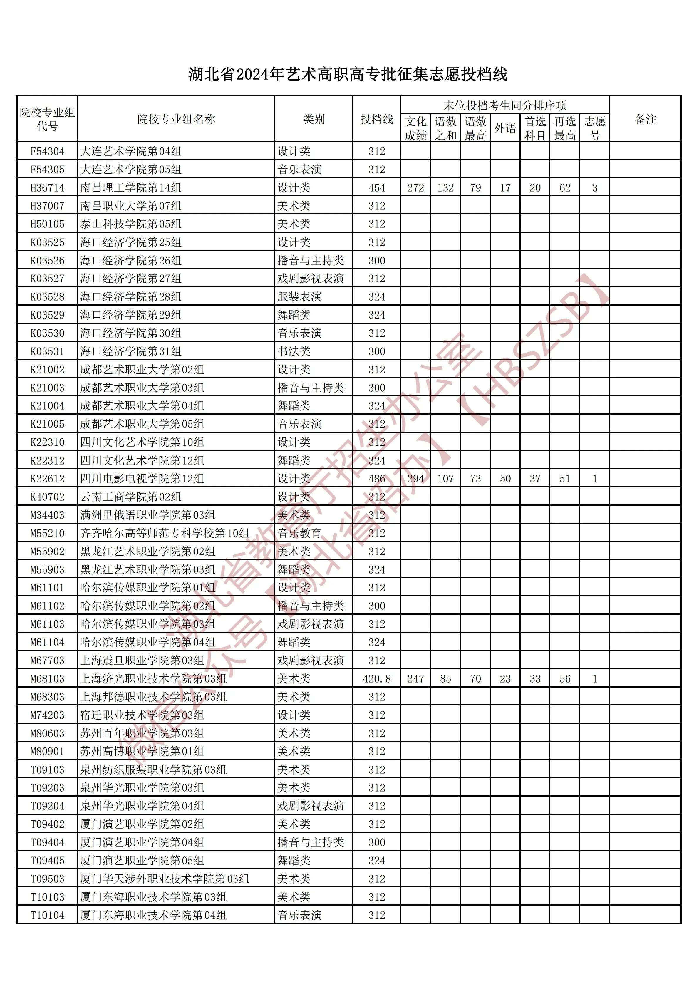 湖北省2024年艺术高职高专批征集志愿投档线