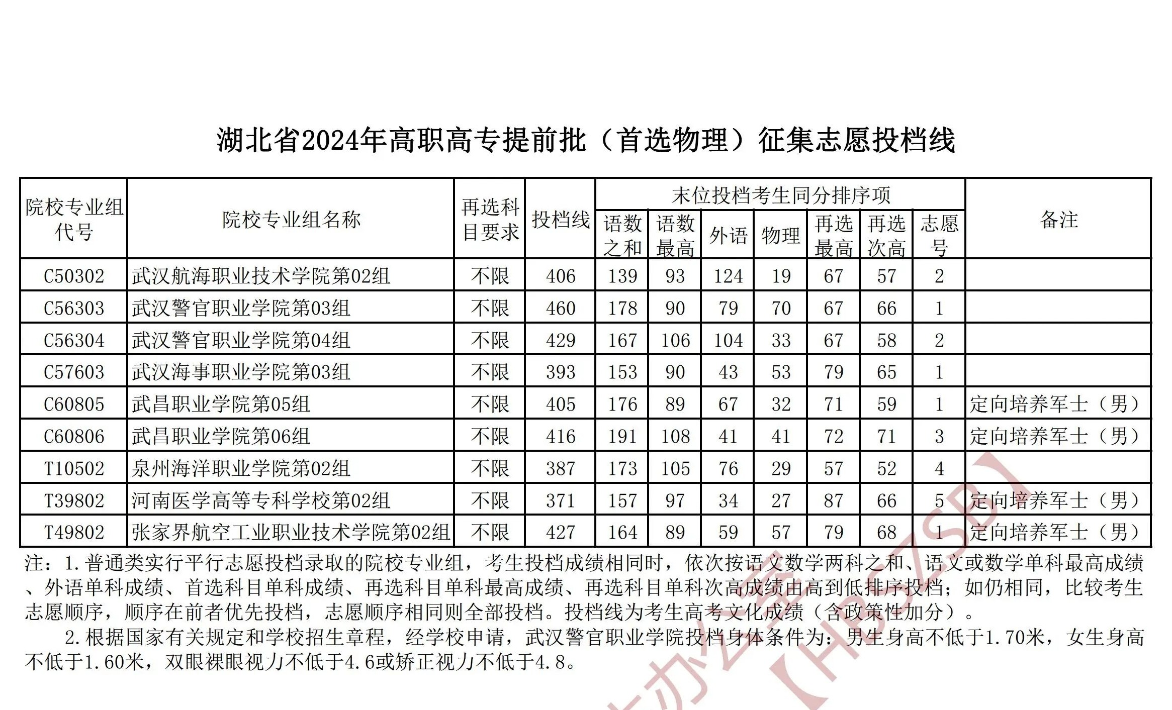 湖北省2024年高职高专提前批(首选物理)征集志愿投档线