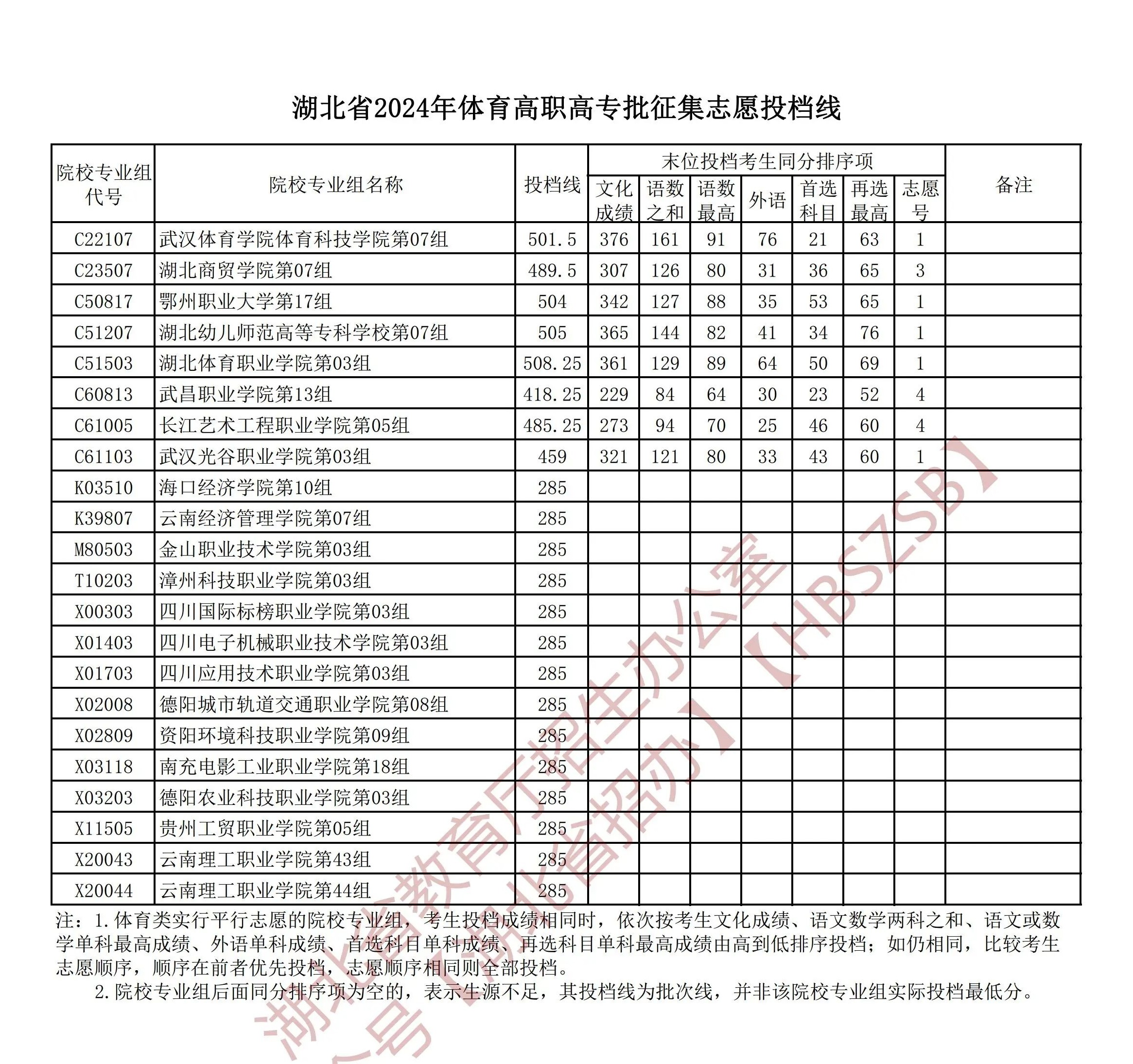 湖北省2024年体育高职高专批征集志愿投档线