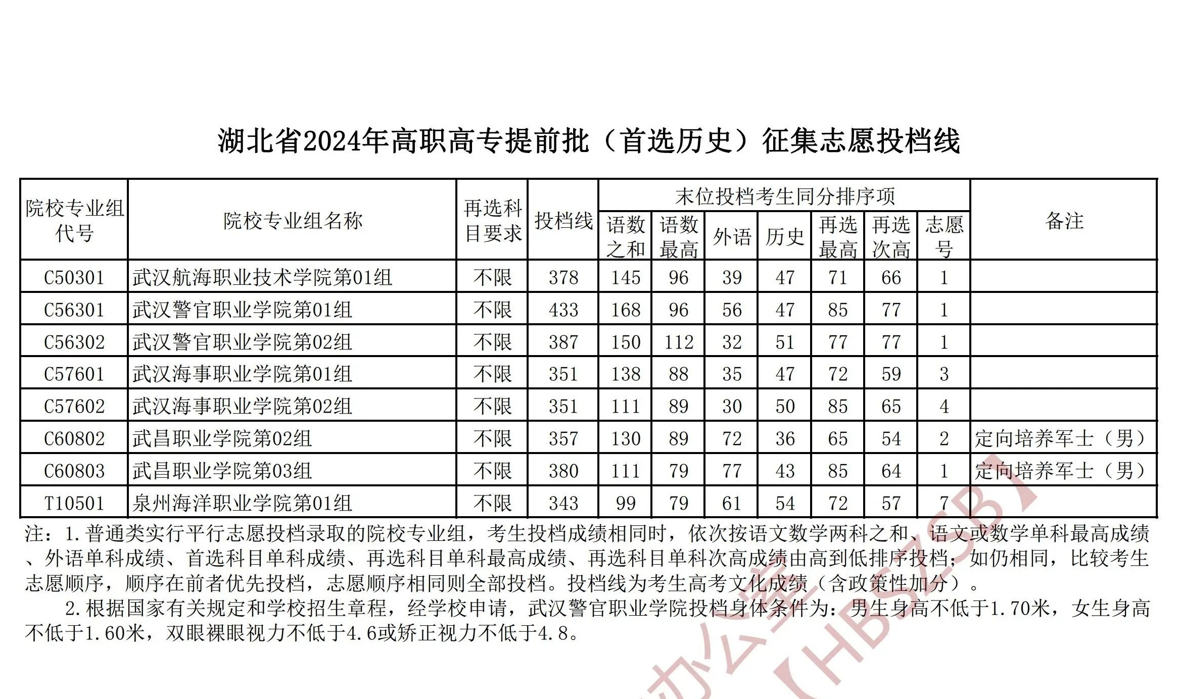 湖北省2024年高职高专提前批(首选历史)征集志愿投档线