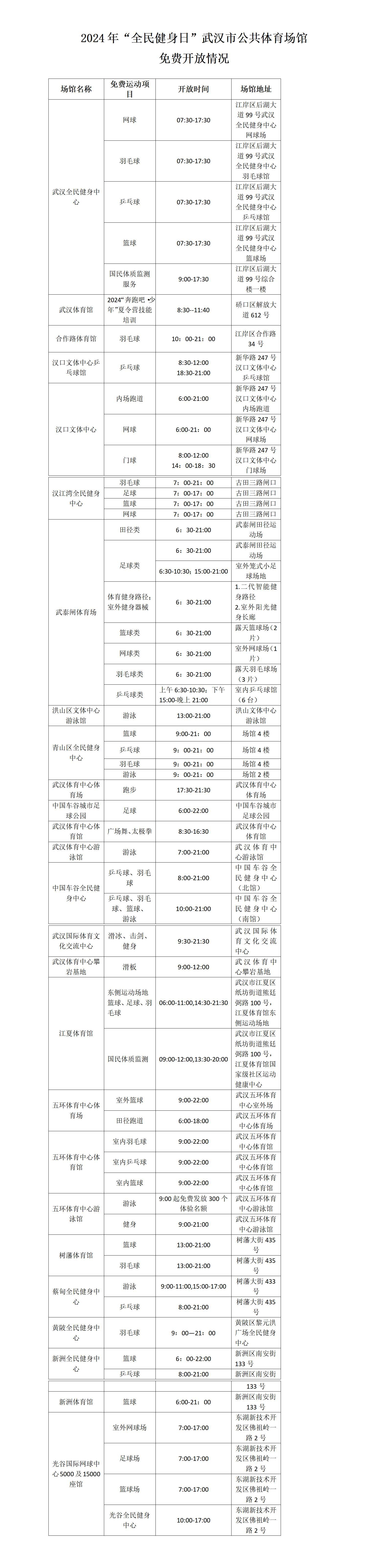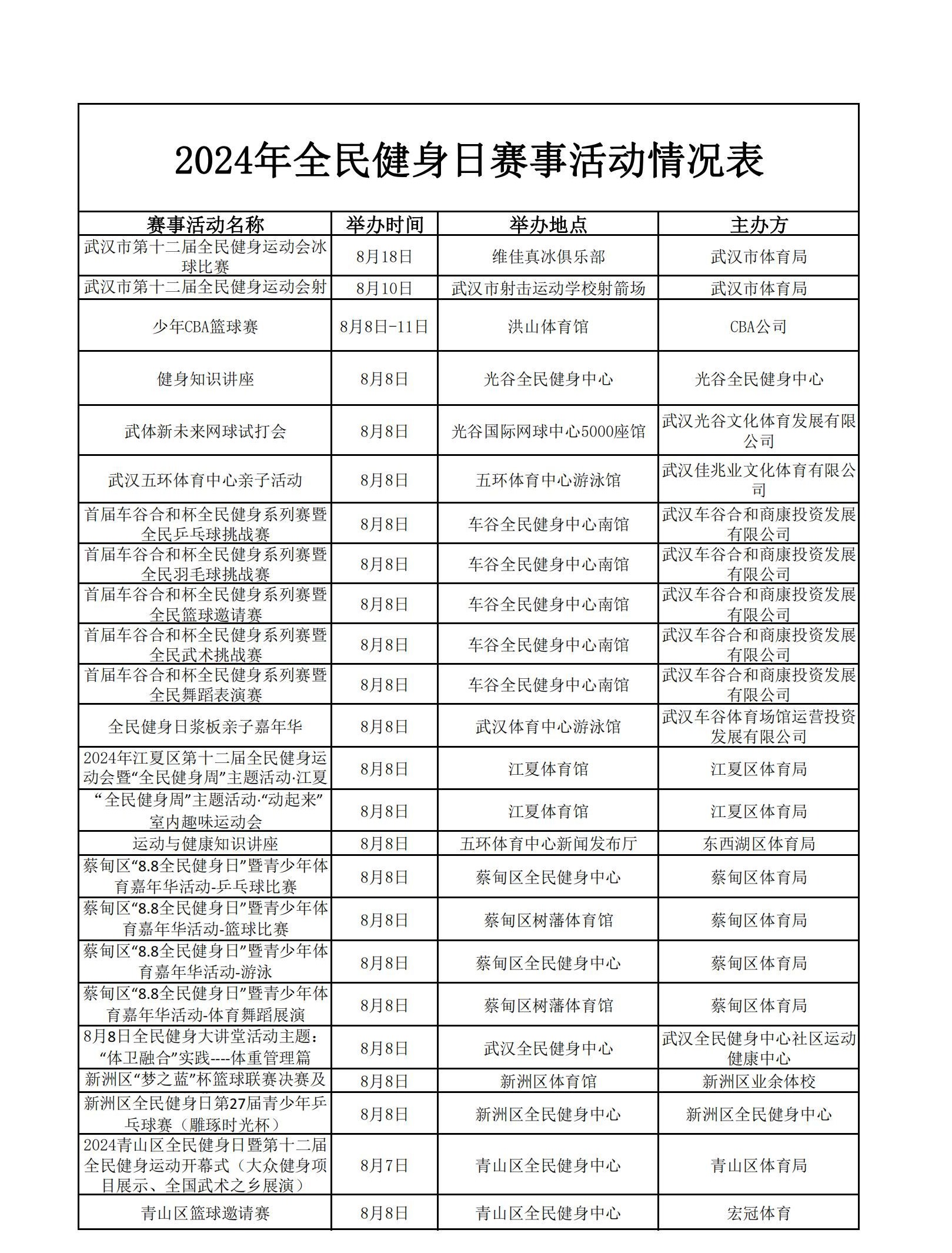 8月8日是“全民健身日”,武汉市20多个公共体育场馆将在相应时段免费开放,欢迎体育爱好者前去运动健身。同时,在8月8日前后的“全民健身日”主题活动期间,武汉还将举办丰富多彩的全民健身赛事活动,欢迎市民参加。