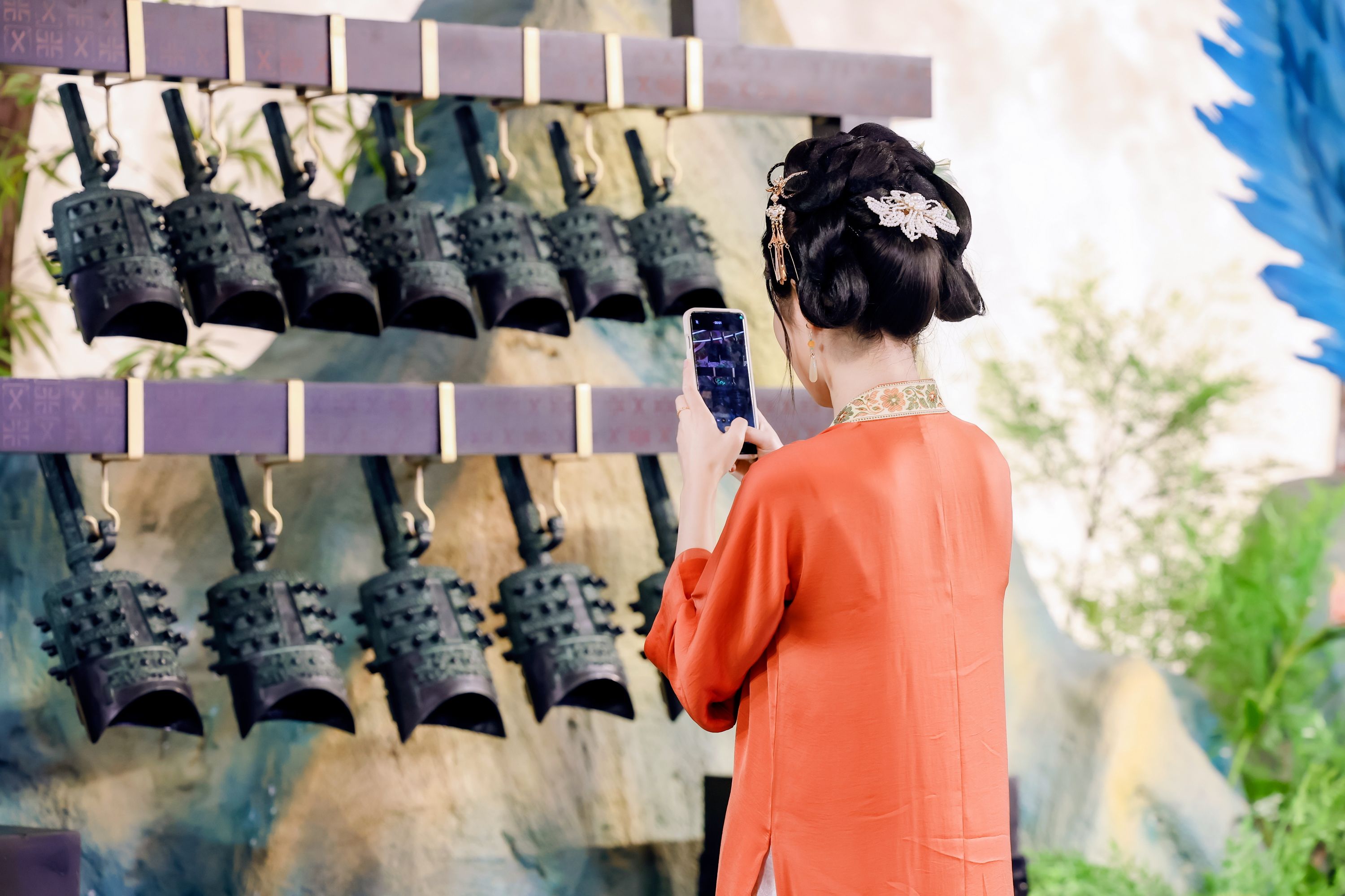 剧场内摆放的编钟吸引游客拍照。