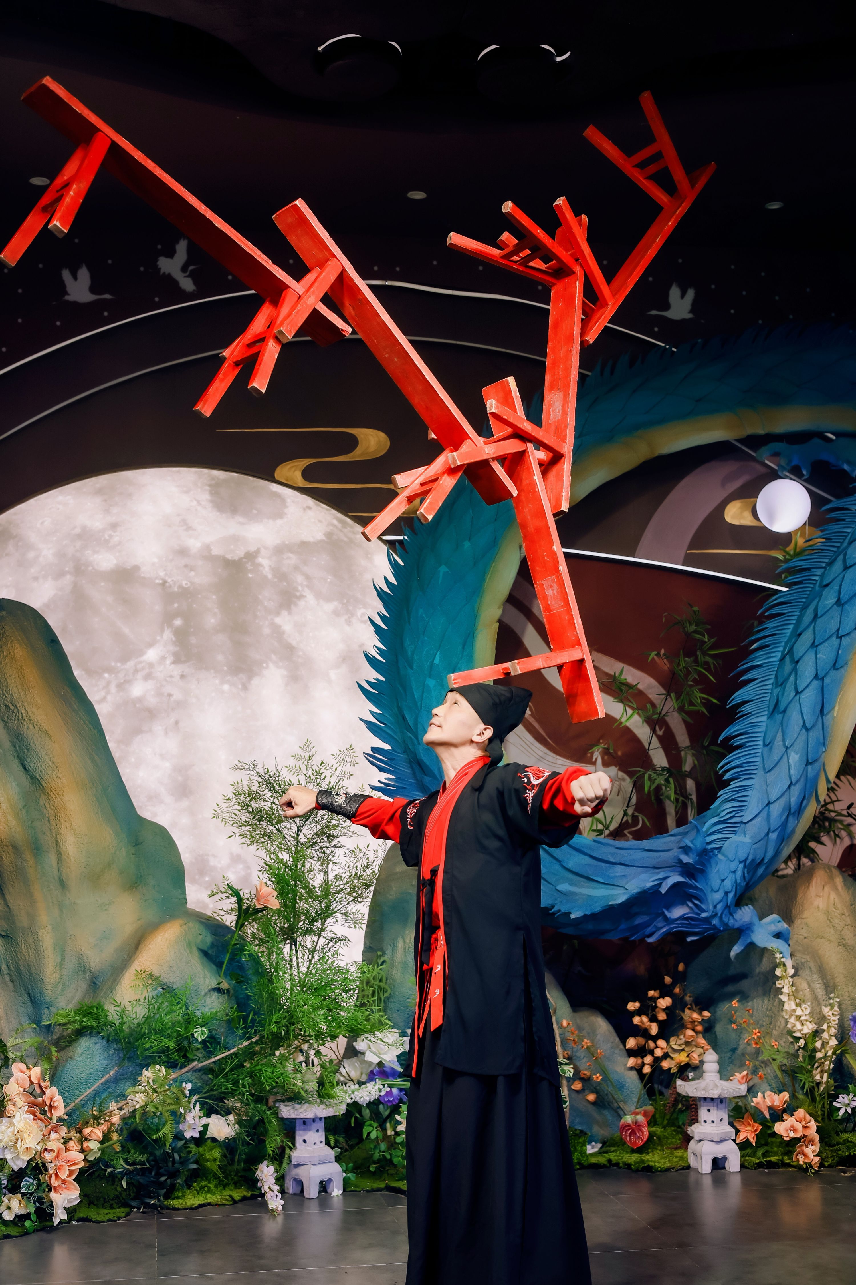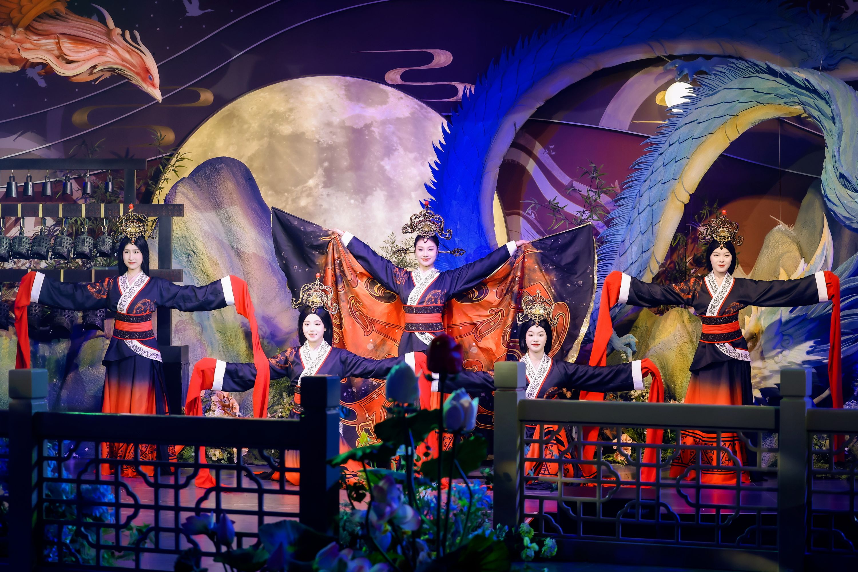 “美食剧场”选址在位于解放大道艳阳天旺角6楼的宴会厅内。记者现场看到,该剧场巧妙地将传统荆楚文化与现代酒店服务相结合,剧场墙面装饰以仿古竹简为主,背景中心点缀着火红的凤凰、飞翔的白鹤与摇曳的竹叶,编钟、战鼓等也搬上了舞台,为游客打造极具楚文化韵味的沉浸式体验。