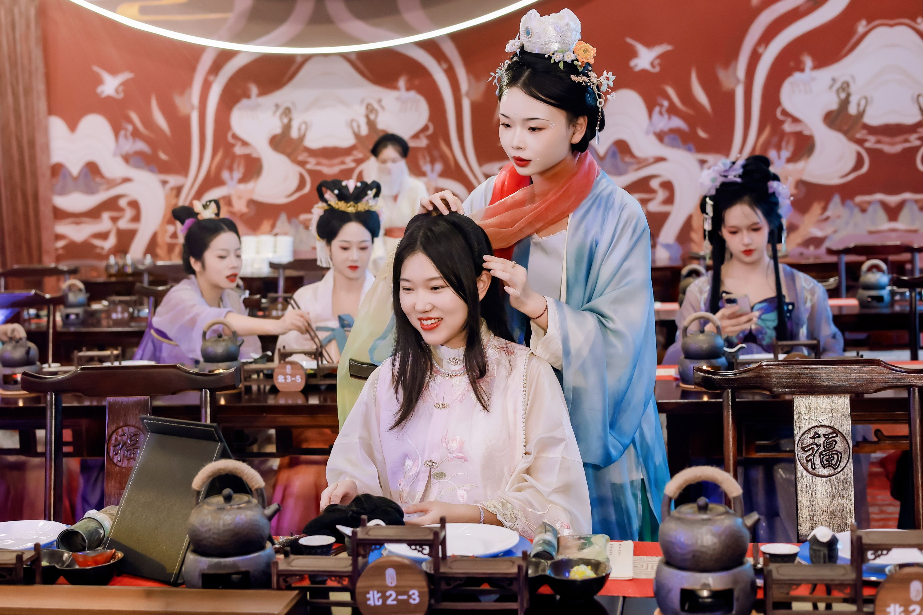 游客在“美食剧场”现场体验汉服妆造。
