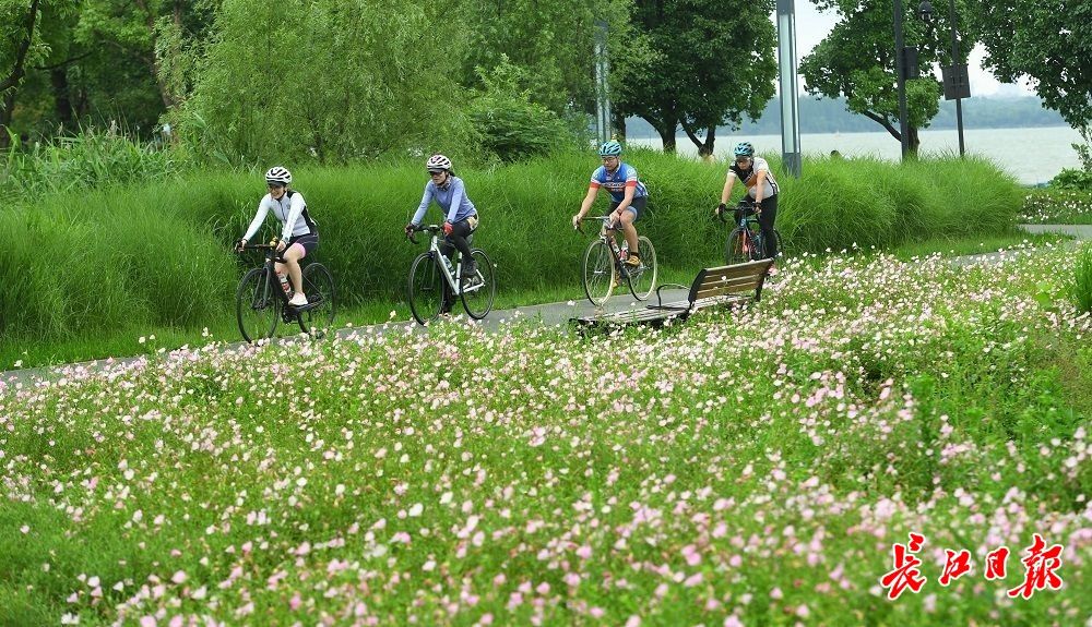 5月16日,市民骑行在开满鲜花的东湖绿道上。长江日报记者高勇 摄