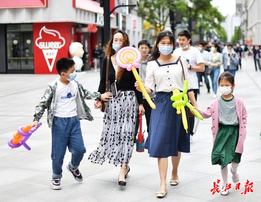 5月16日,家长们带孩子漫步江汉路步行街。长江日报记者詹松 摄