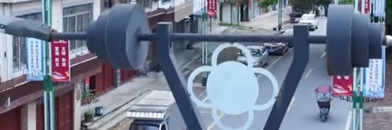九派新闻发现,在石智勇的老家广西桂林五通镇,连路灯都是杠铃造型。