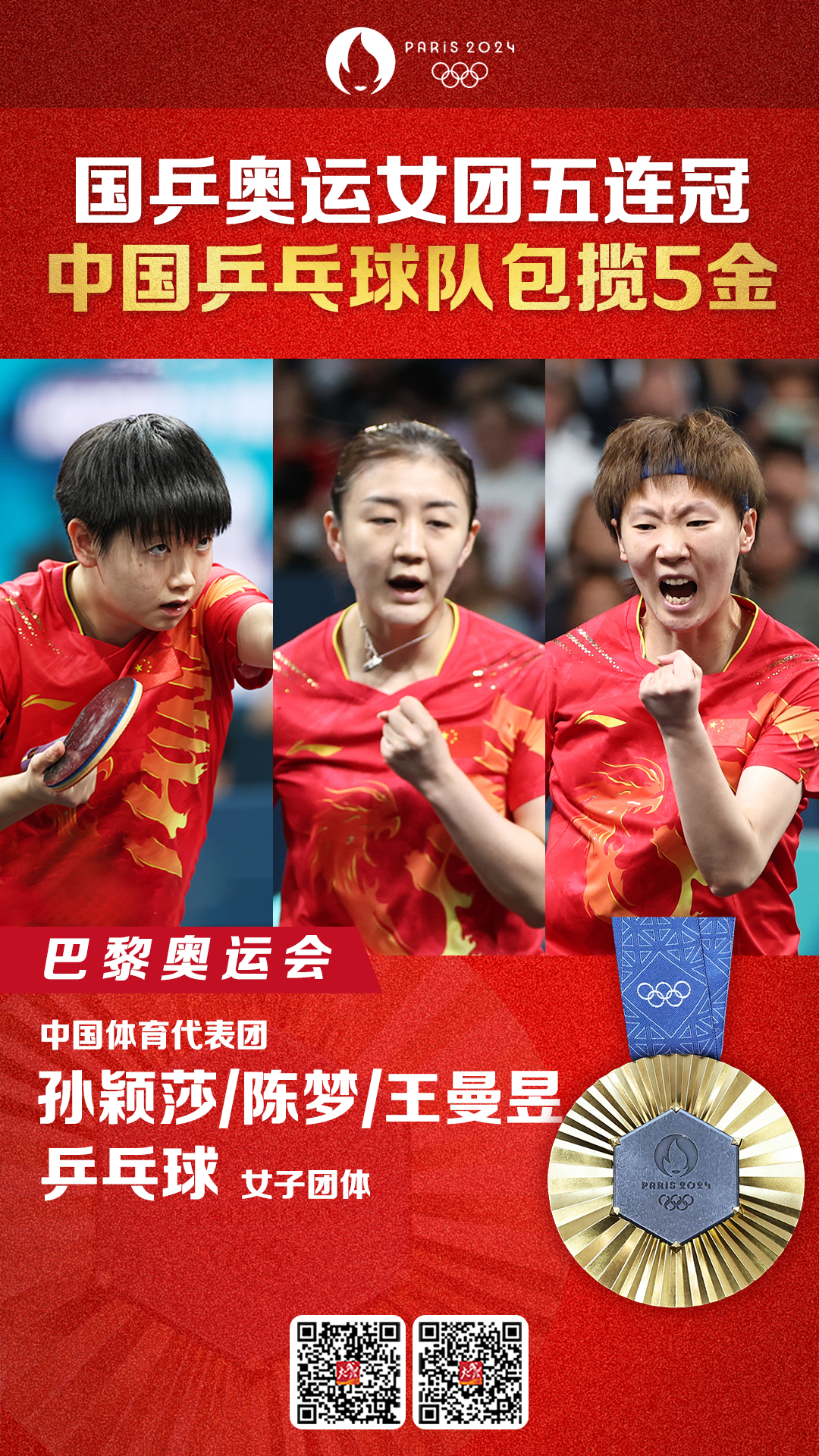 当地时间8月10日,巴黎奥运会乒乓球女子团体决赛在南巴黎竞技场4号馆进行。由孙颖莎、陈梦、王曼昱组成的中国队战胜由早田希娜、平野美宇和张本美和组成的日本队,夺得金牌。中国乒乓球队连续第五次获得奥运会女团冠军。