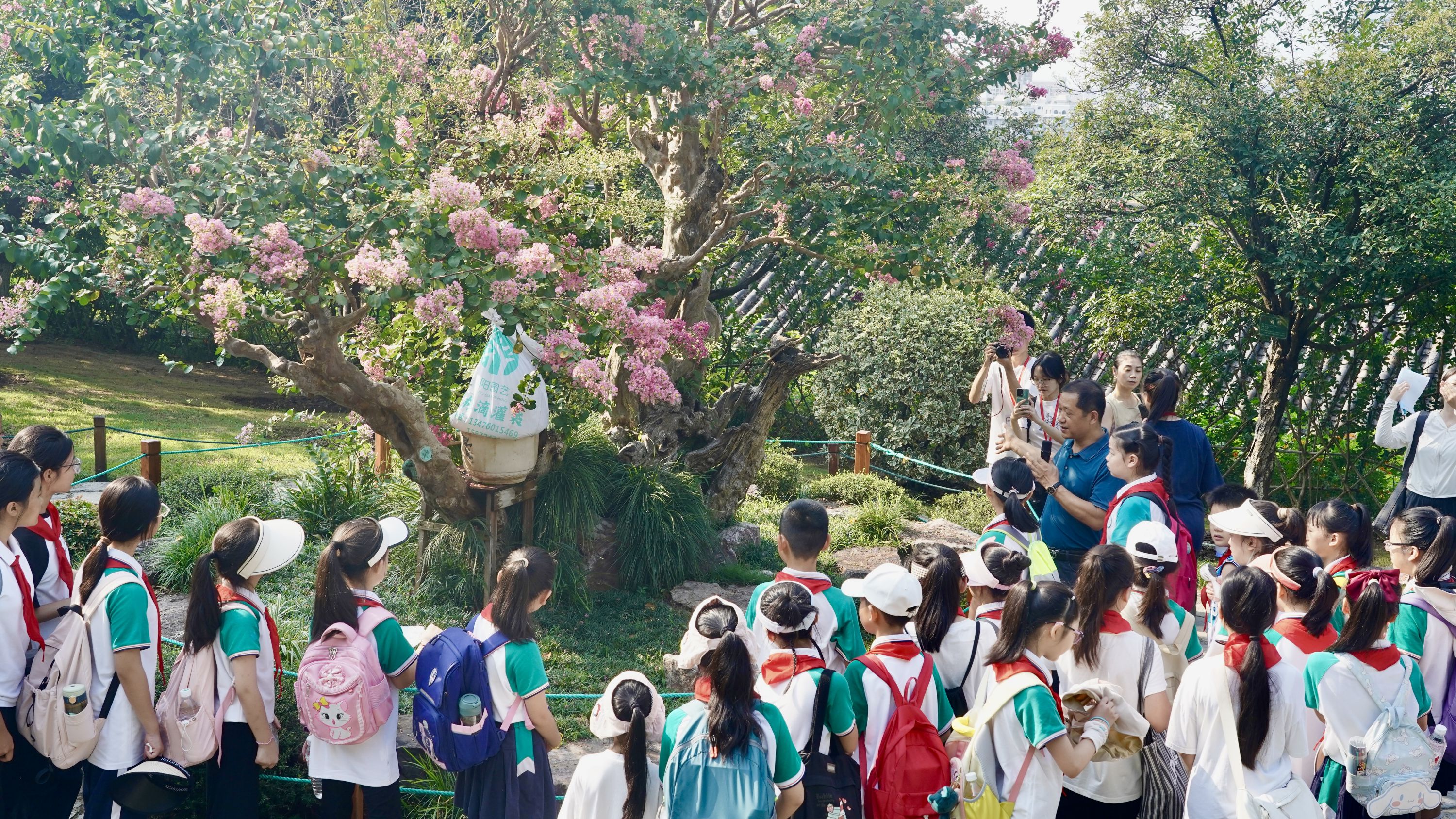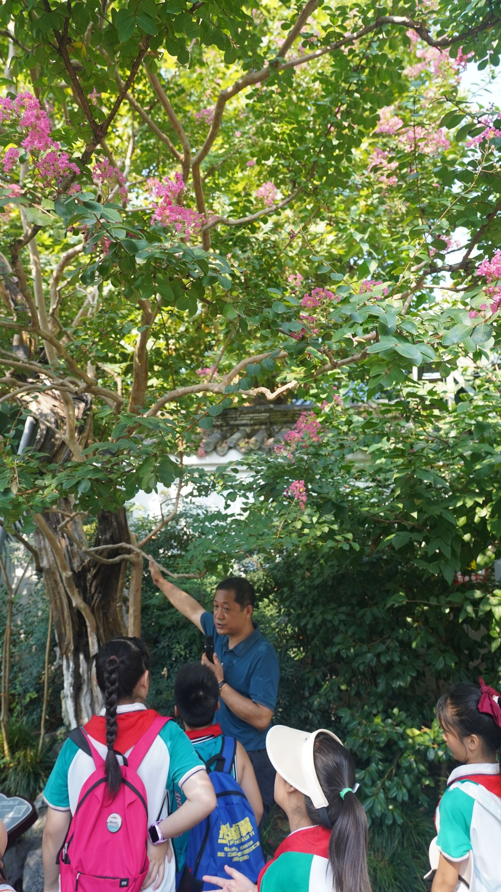 “紫薇花花色丰富,总体上分为四种类型:紫薇、赤薇、银薇、翠薇,在这里都能看到。”黄鹤楼公园紫薇苑养护专班负责人雷勇涛是此次研学活动的讲师,也是远近闻名的紫薇控花“魔术师”,孩子们跟随他的步伐,在开满紫薇花的小径上边走边听。