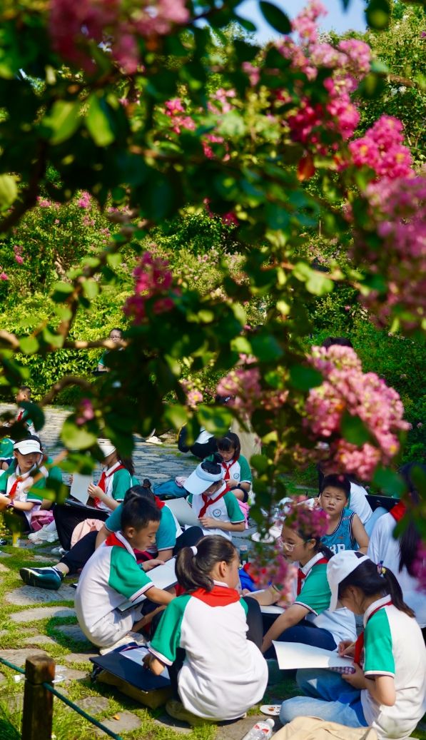 当前,黄鹤楼公园紫薇苑的紫薇花迎来二次开花。8月14日上午,来自武汉市大兴路小学的30余名学生在紫薇苑开展主题研学活动,在全国生态日前夕,大家共同用画笔绘出湿地花城武汉的生态美。