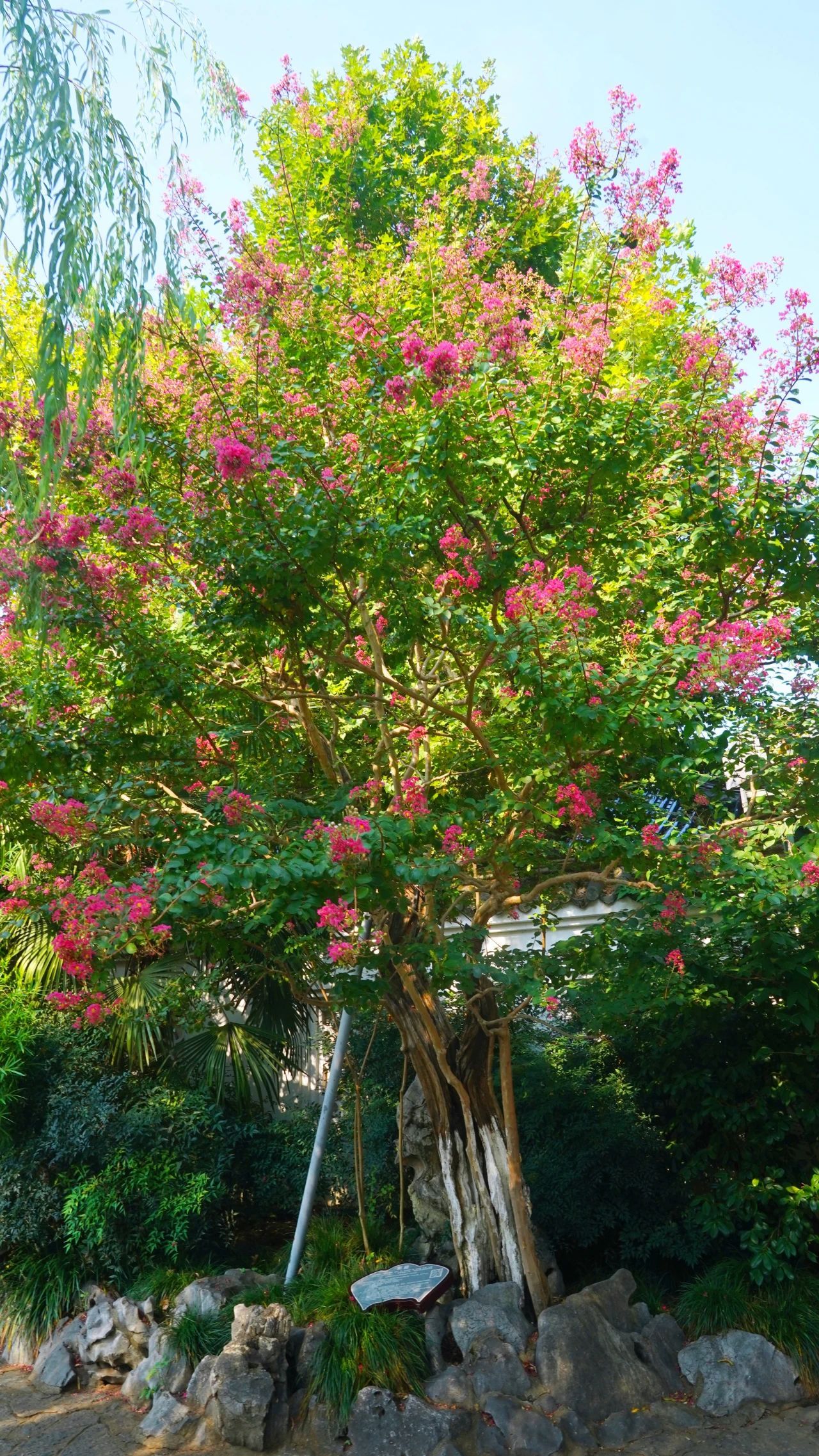 黄鹤楼公园里两株最特别的紫薇古树受到学生们的格外关注,一株在紫薇苑入门处的花坛,已有200多岁,其原生枝条质朴简洁,却在雷勇涛的“嫁接魔法”下实现了“古木逢春,花开四色”的奇迹;另一株在鹅池湖畔,已经350余岁了,历经数次雷击仍屹立不倒,如今花开灿烂、枝叶繁茂,展现着生命的坚韧。