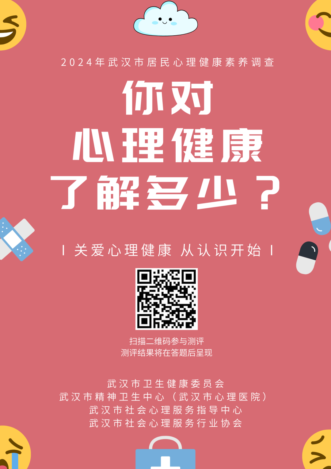 根据《健康中国行动(2019—2030年)》及健康武汉工作要求,为了解武汉市居民心理健康素养水平,武汉市卫生健康委员会、武汉市心理医院组织开展2024年武汉市居民心理健康素养调查。扫描海报中或下方二维码即可开始测验,测验结果将在答题后呈现,所有个人信息均严格保密。