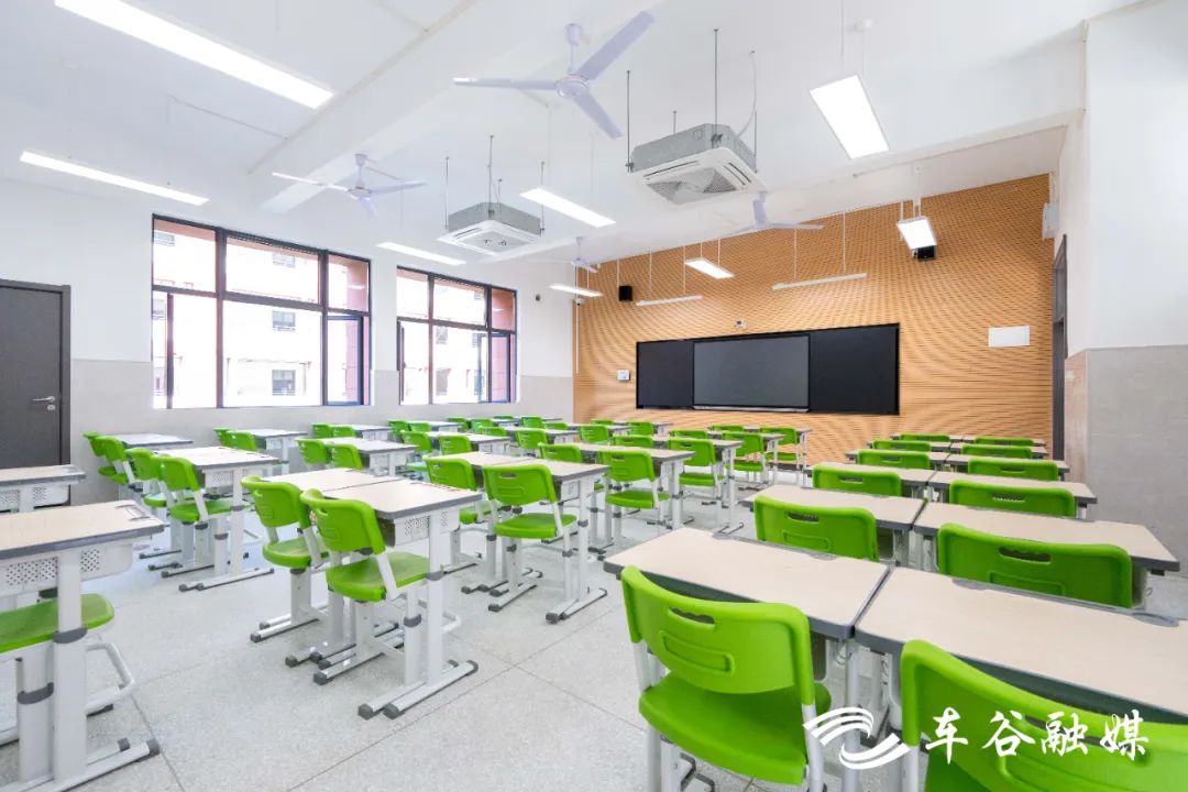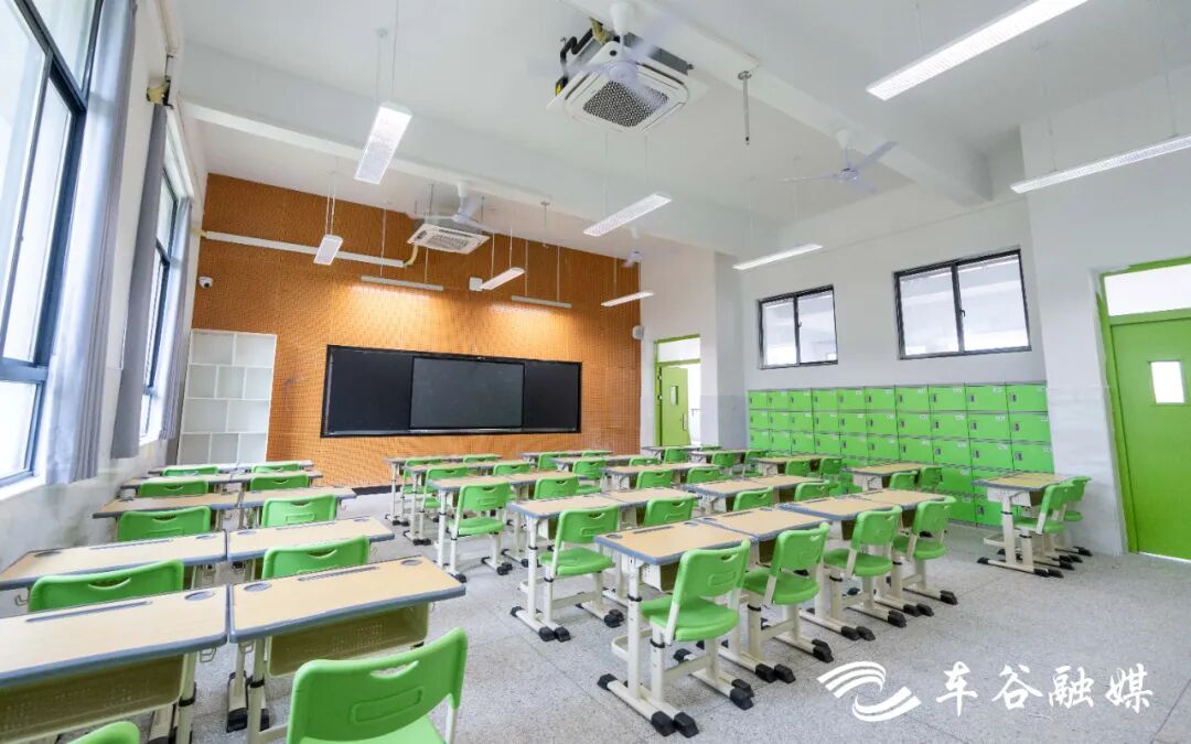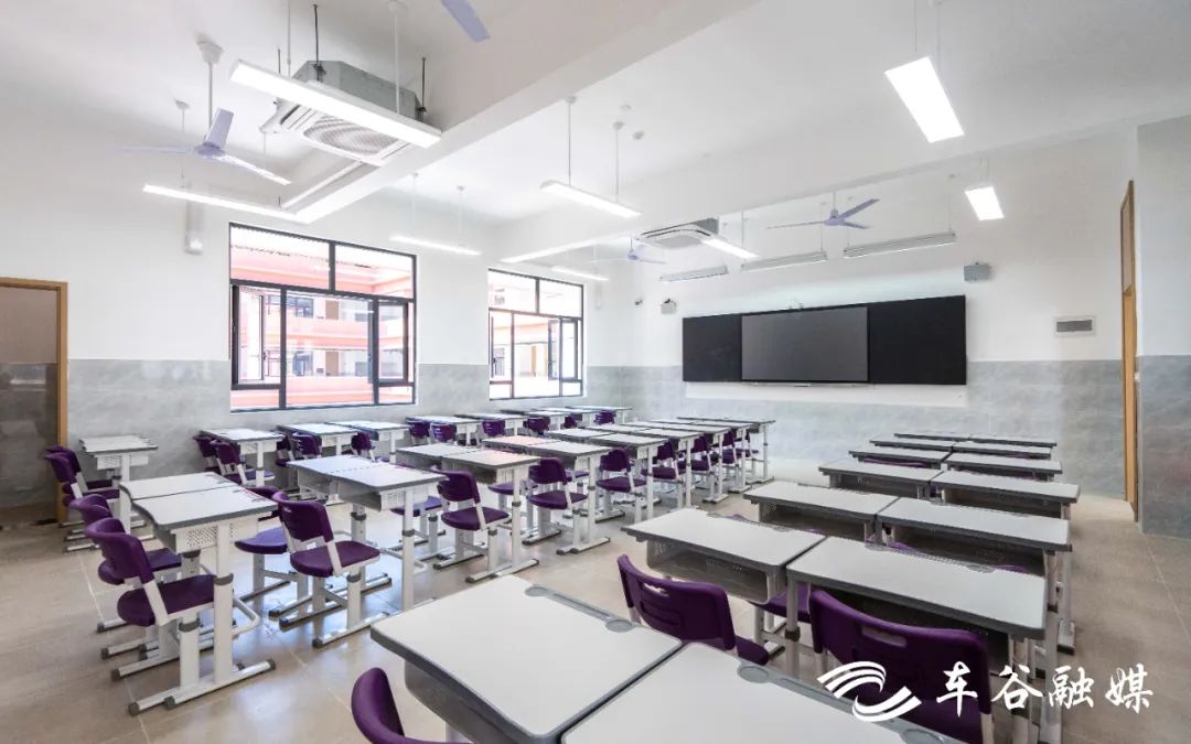 目前,校园基础设施建设均已全部完工,正在进行校园环境文化建设。教室里,电子班牌、智慧黑板已全部安装到位,桌椅板凳、储物柜也整齐摆放,正等待第一批学生到来。