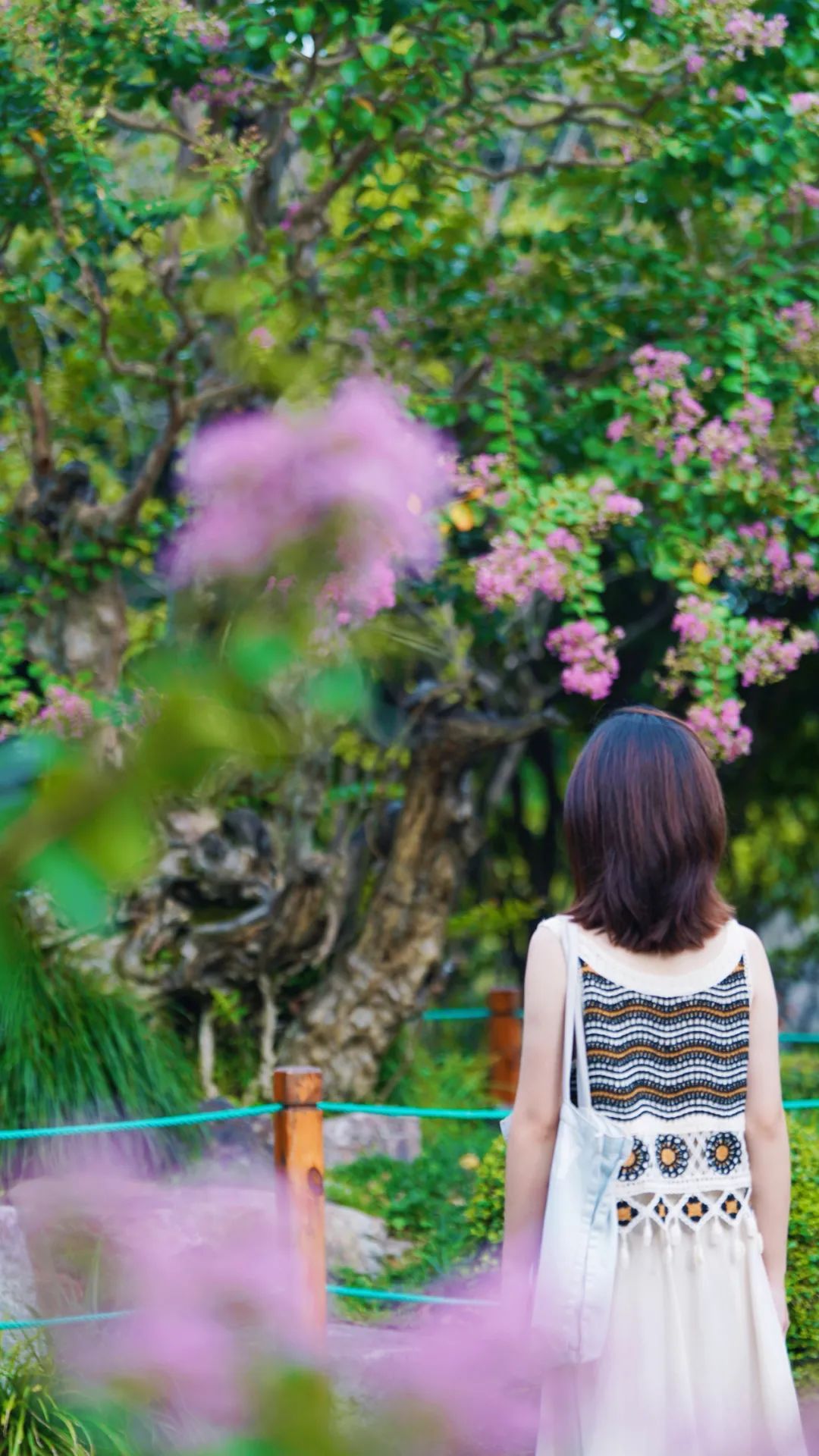在盛开的紫薇树下