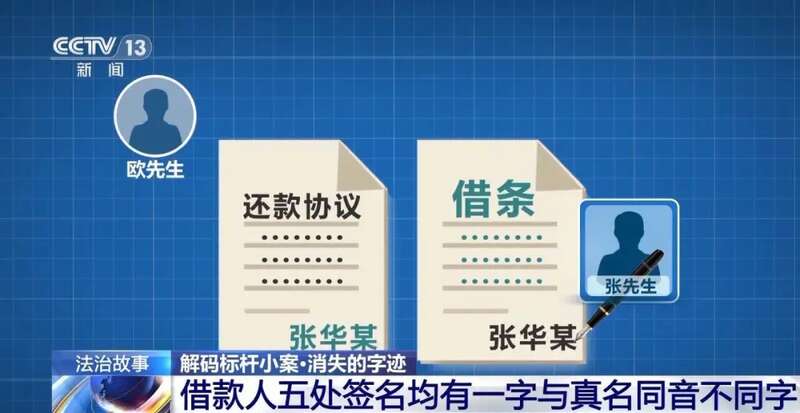 此次书写的借条和还款协议中,张先生的五处签名均有一字与其真名同音不同字,但欧先生当时并未在意。