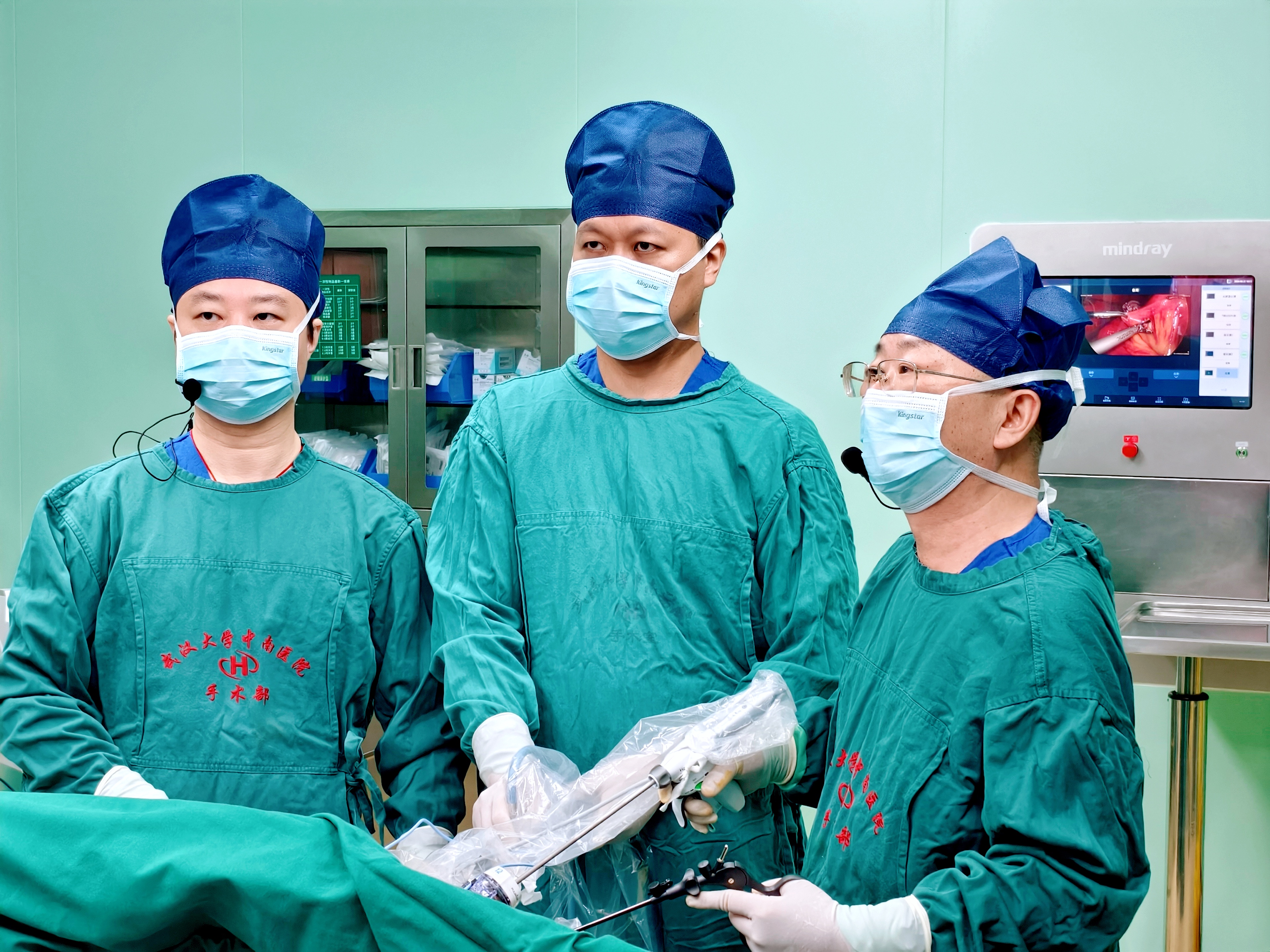 潘定宇(右一)、李震(左一)、龚铖(左二)团队正在减重手术直播中。