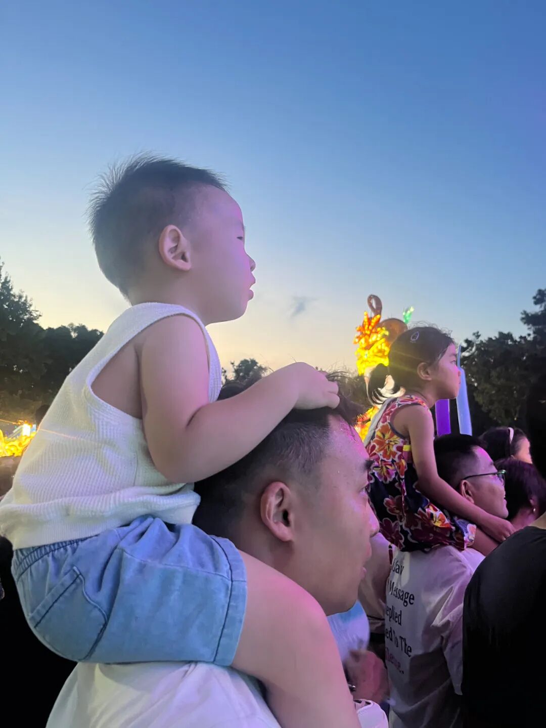 儿子坐在爸爸肩膀上看表演。大武汉客户端网友@毛晓娇 摄
