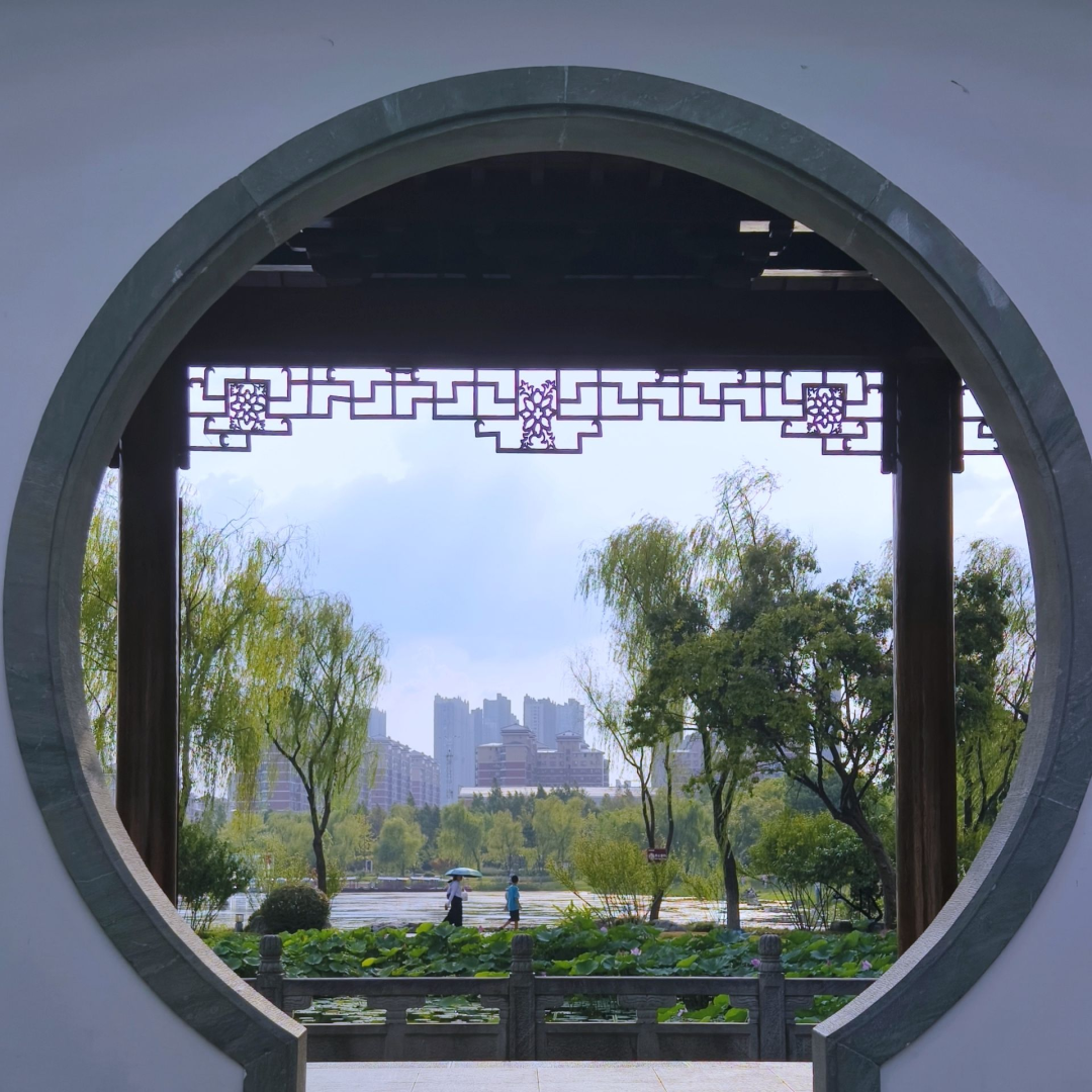 在武汉园博园杭州园,游人走在园里,蓝天、树木、湖水、荷叶,共同构成了一幅初秋风景画。