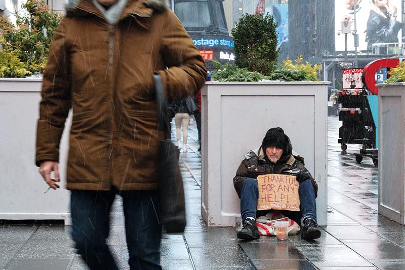 一名无家可归者坐在美国纽约时报广场上(2024年1月19日摄) 新华社/法新
