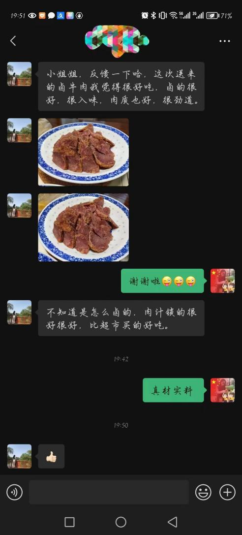 福建用户郭先生在朋友圈分享到:“第二次回购了,是很入味很好吃的牛肉!请客配酒很方便,推荐了好几位好友!卤味店一斤一百元,酒店就更不止了,口感还没有这个好!”