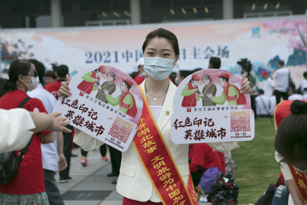 武汉文旅志愿者在主会场现场开展志愿服务。