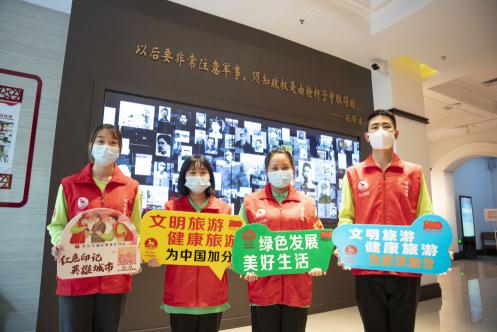 在熙来攘往的人流中,身着“红马甲”、佩戴宣传绶带的文旅志愿者穿行其中,向游客发放文明旅游宣传资料,倡导文明、轻声、控烟、垃圾分类等文明旅游行为,传递文明旅游、健康旅游观念,并邀请游客扫码“打卡闪亮坐标”。