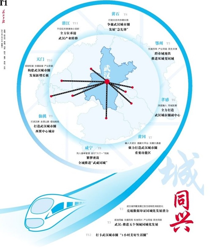 长江日报记者从武汉城市圈首次联席会第一次会议上获悉,经武汉市、黄石市、鄂州市、孝感市、黄冈市、咸宁市、仙桃市、天门市、潜江市(以下简称“九市”)协商一致,九市达成同城化发展协议。为给武汉城市圈同城化发展营造良好舆论氛围,助力武汉发挥“一主引领”作用,5月19日,长江日报依托长江网成立武汉城市圈新闻中心,并推出《9城同兴》特刊。同日,长江网(小程序端)推出城市圈频道。详见>>