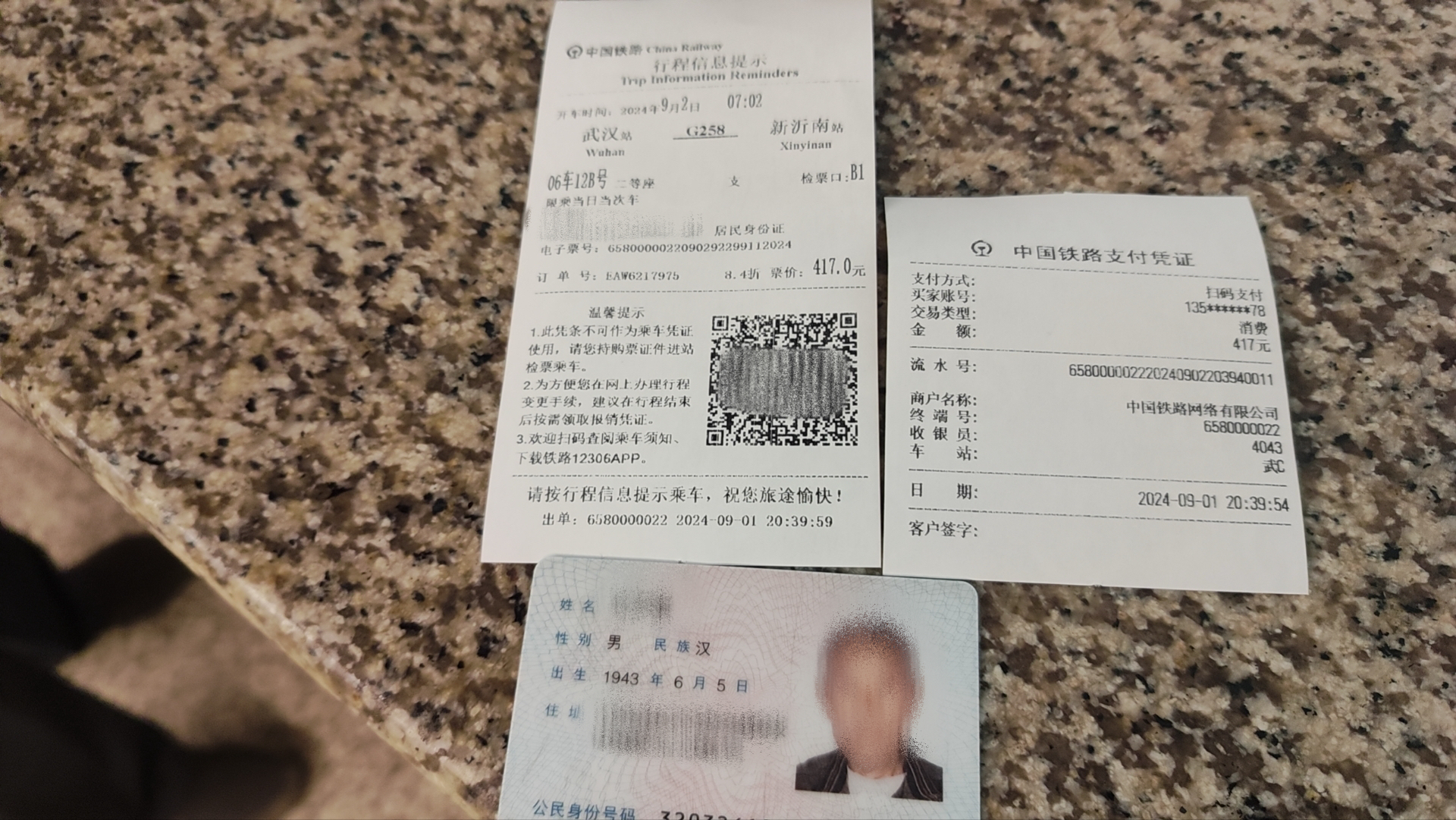 已经下班的黄梅向车队汇报情况,停好车辆,领着老人到武汉火车站售票大厅购票。咨询售票窗口工作人员得知,武汉火车站至新沂南站的高铁票价为417元,发车时间为次日7时02分,而老人身上仅有300元现金。