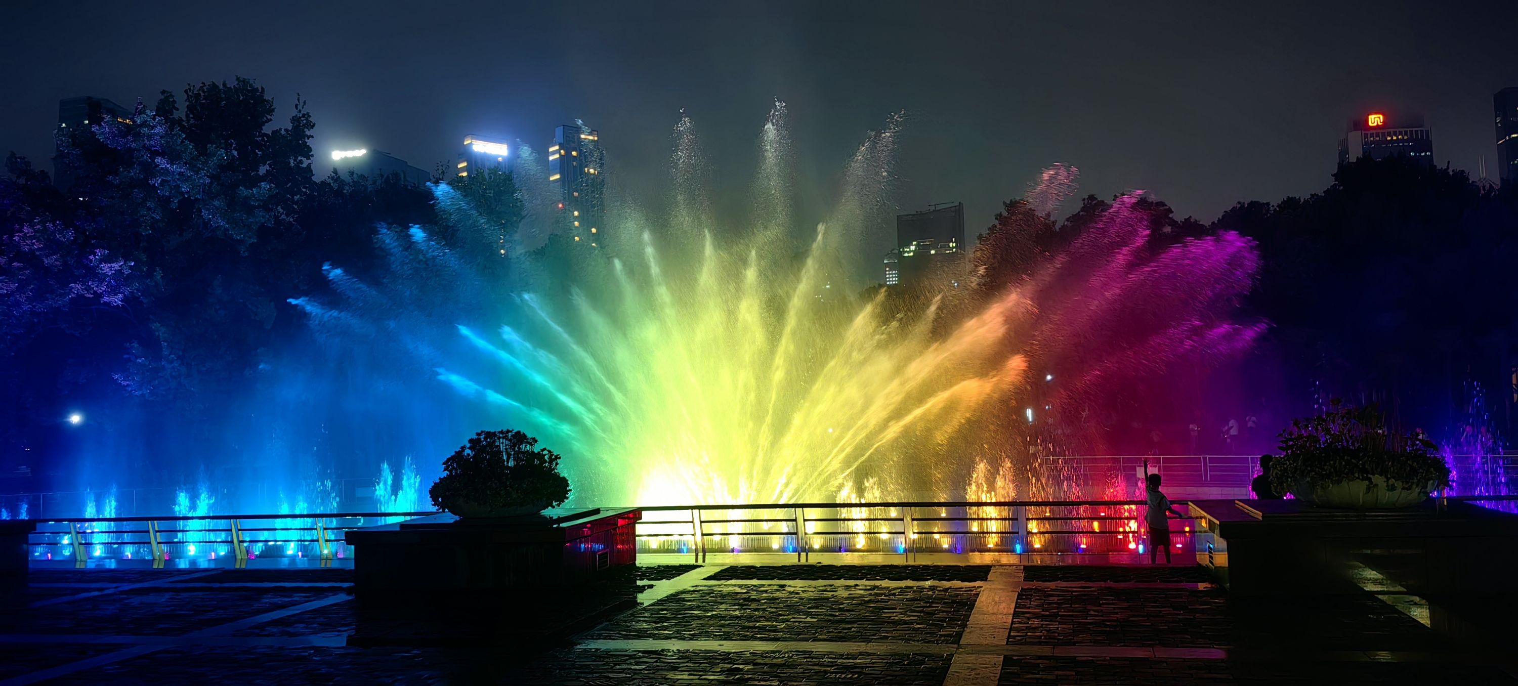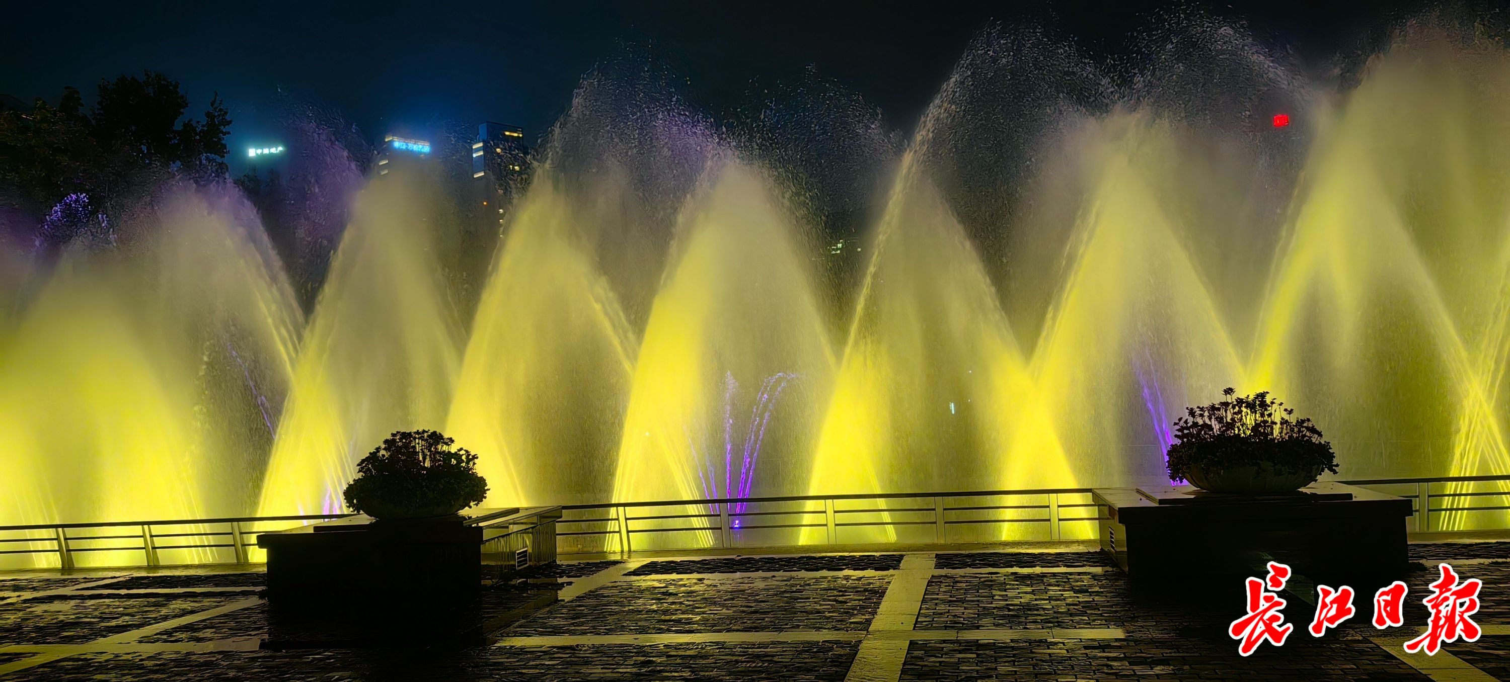 2日19时,长江日报记者在中山公园中区看到,随着喷泉打开,音乐响起,水池内的喷头喷出各种各样的水花。水花在七彩灯光辉映下,交替舞出“跳跃彩虹”“海浪”“舞动屏风”“礼花”“松塔”“烟花”“孔雀开屏”“彩虹桥”“大鹏展翅”和“烟雾”等10种花型。