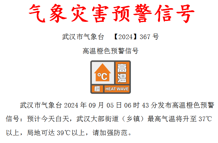 今天6时43分,武汉市气象台发布高温橙色预警信号: